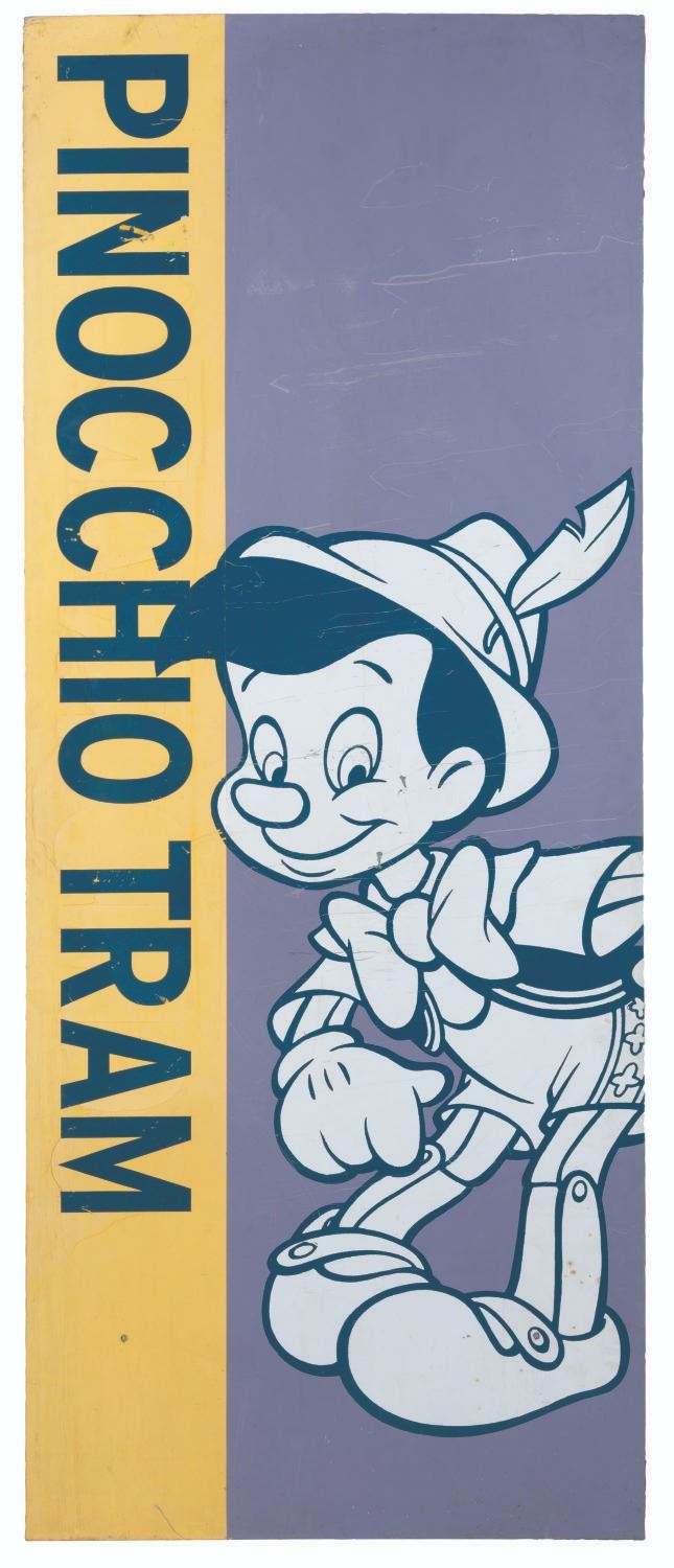 (Disneyland, 1998-2000s) A large sign for the Pinocchio tram at the Disneyland Resort, which provided service to the Pinocchio parking area. The tram was later renamed the Mickey and Friends tram and the entire lot closed in 2018, replaced by the Pixar Pals parking structure. Measuring 33" x 81" tall, the metal sign is in good condition with wear from Resort use including heavy scratches, scuffs, paint loss, spotting, and light oxidation. Due to size and weight, special shipping arrangements are required. Please inquire before bidding.