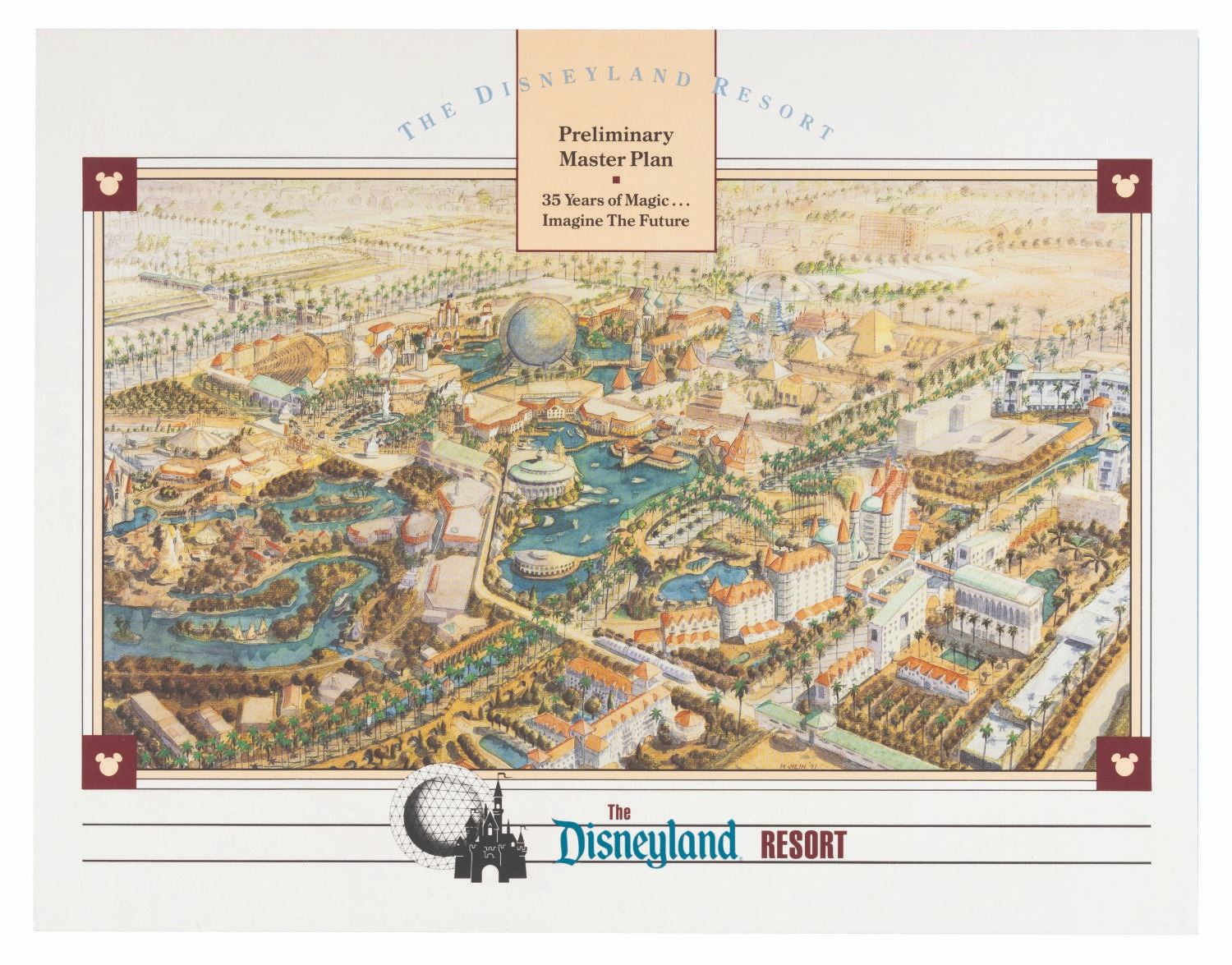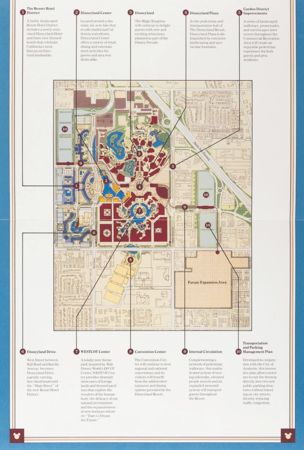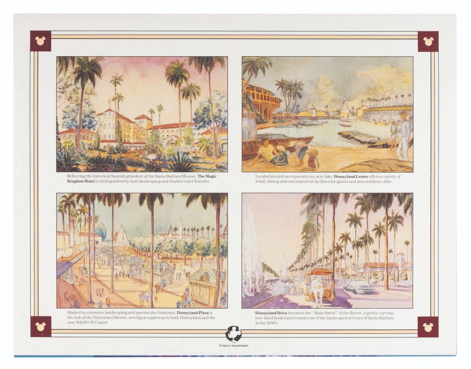 (Disneyland Resort, 1990) A promotional brochure summarizing the master plans for an EPCOT-style WESTCOT Park at Disneyland Resort. The plan was later abandoned in favor of Disney's California Adventure, built on the same site. Measuring 8.5" x 11", the brochure is in very good condition with light scratches and wear.