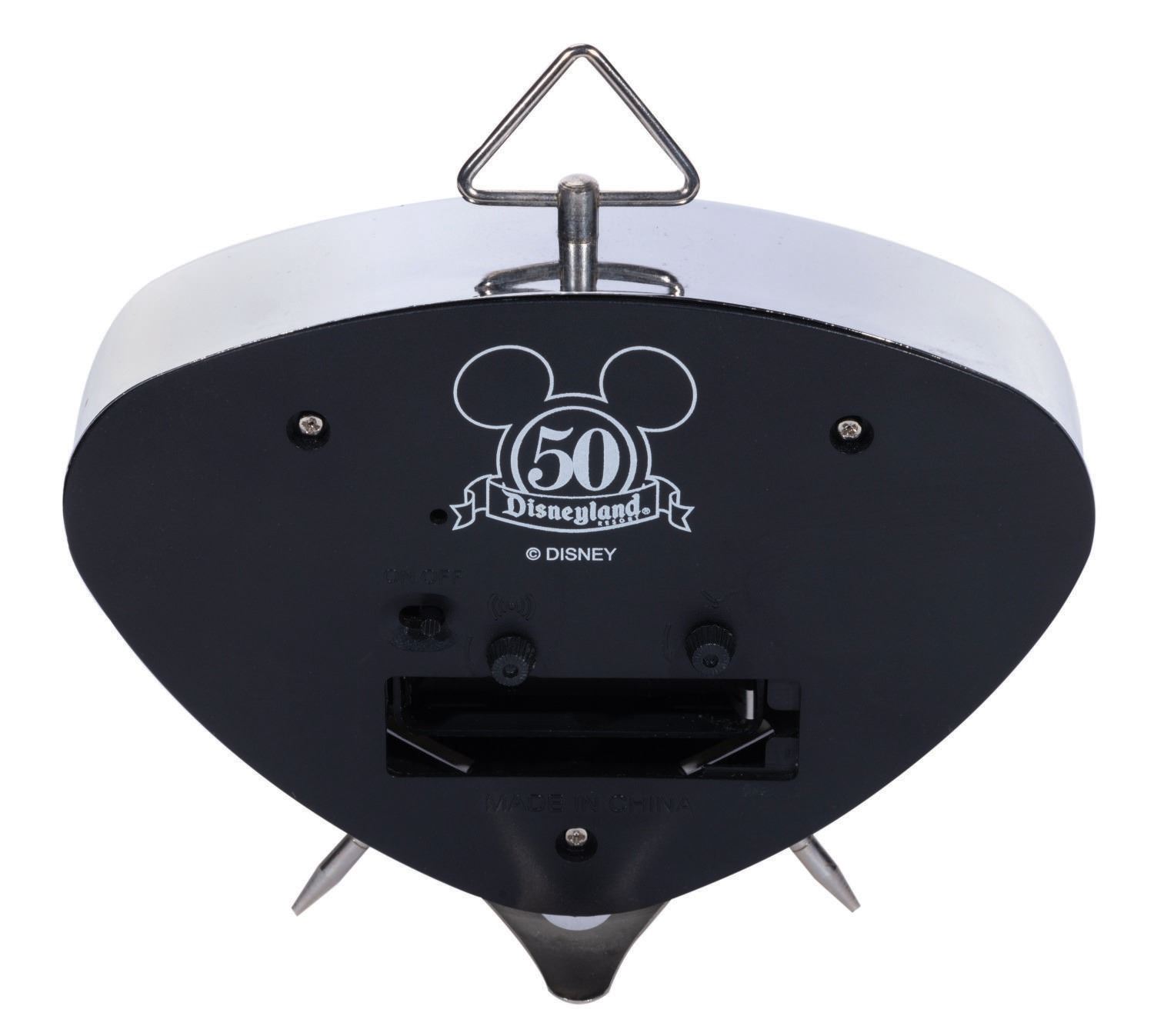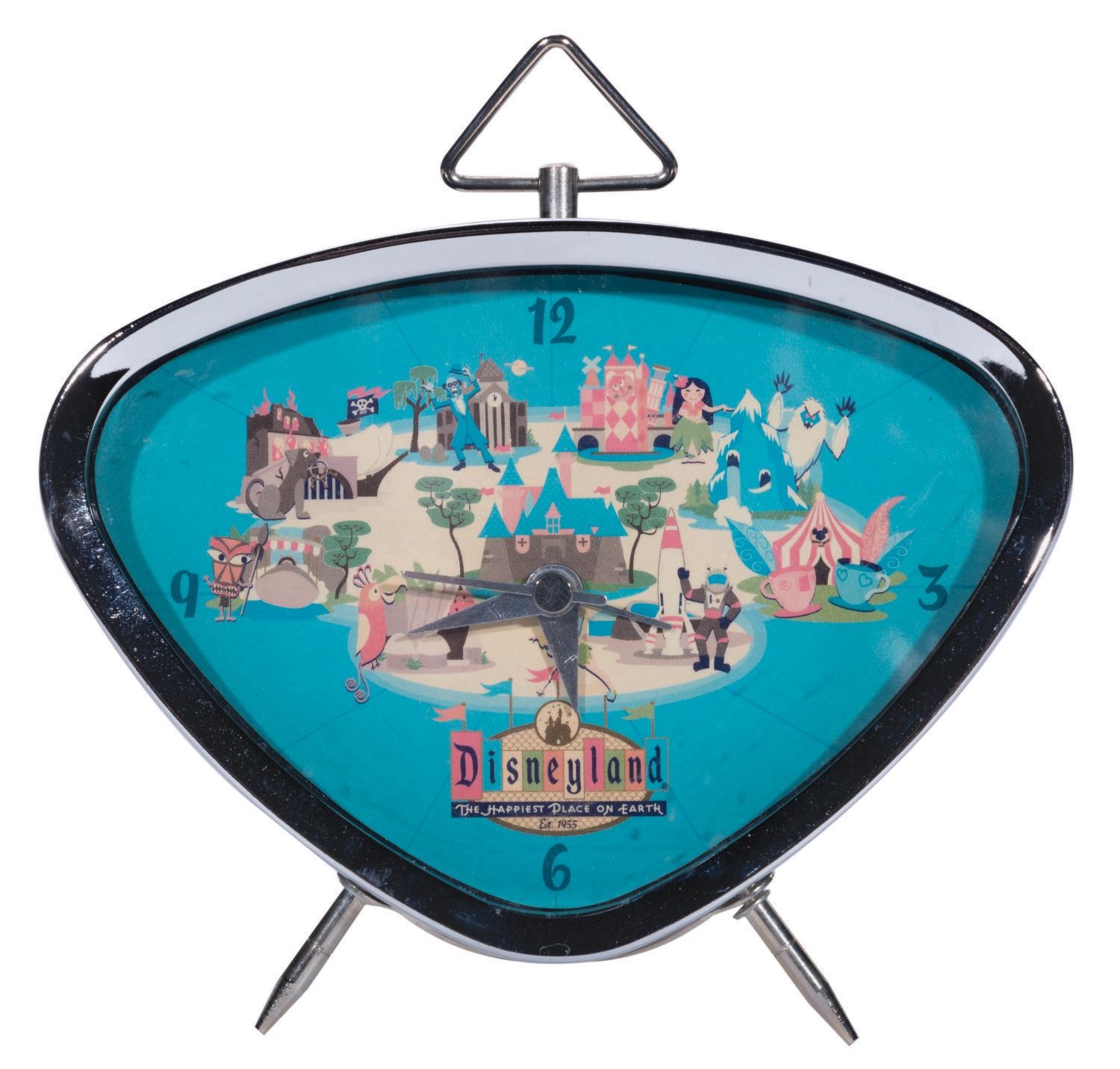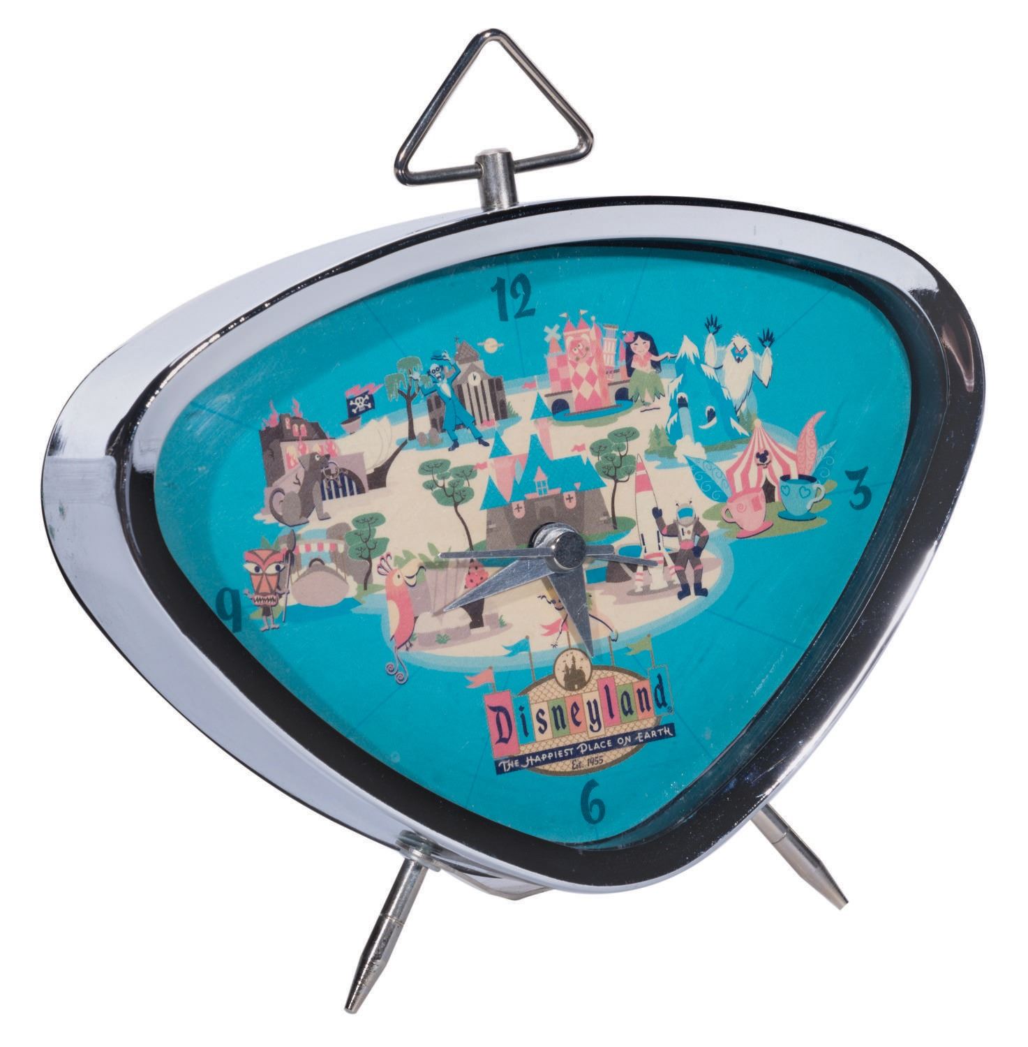 (Disneyland, 2005) A Disneyland retro-style clock celebrating the 50th anniversary of Disneyland Resort. The face contains a stylized map of the Park accented with characters and attractions. Measuring 5.5" tall and 6" wide, the clock is in very good working condition with minor fading to face and scuffs to the crystal.