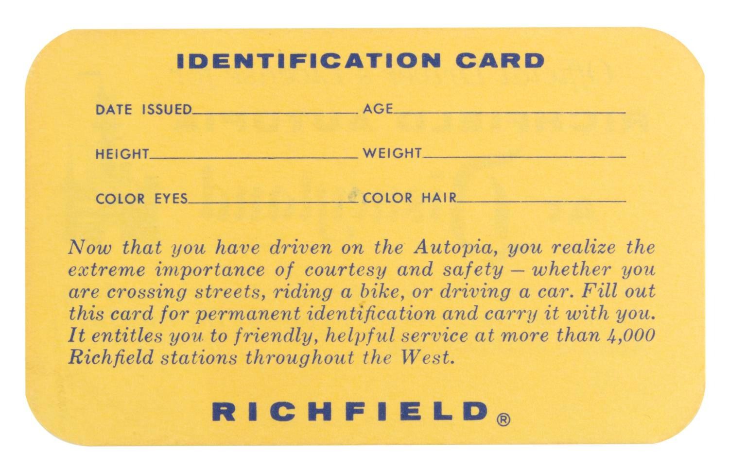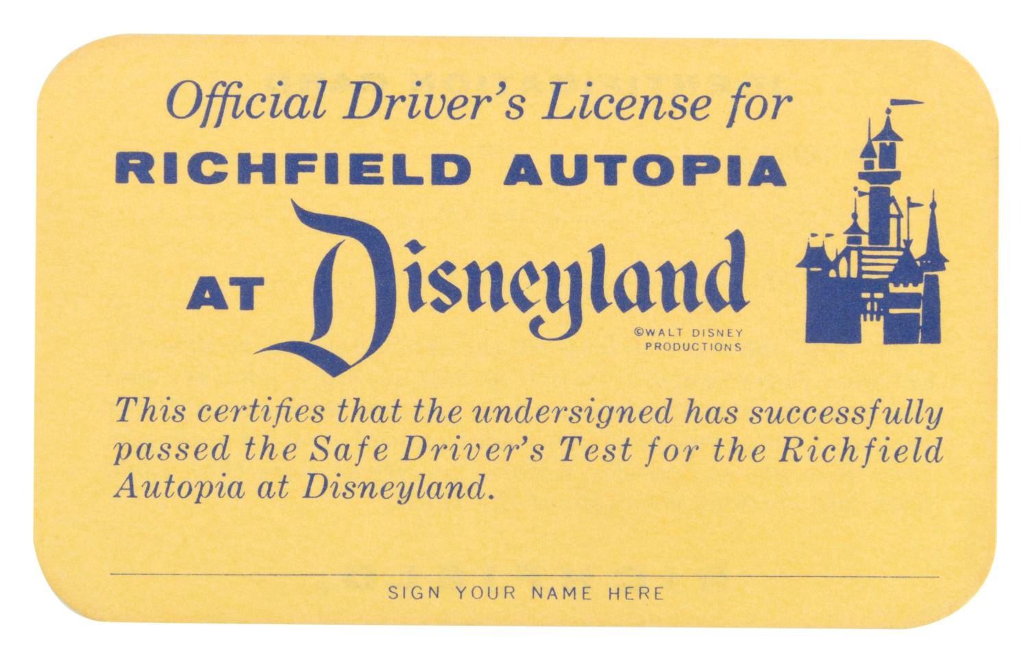 (Disneyland, 1960s) An unused Official Driver's License for the Richfield Autopia at Disneyland. Measuring 2.5" x 4", the license is in fine condition.