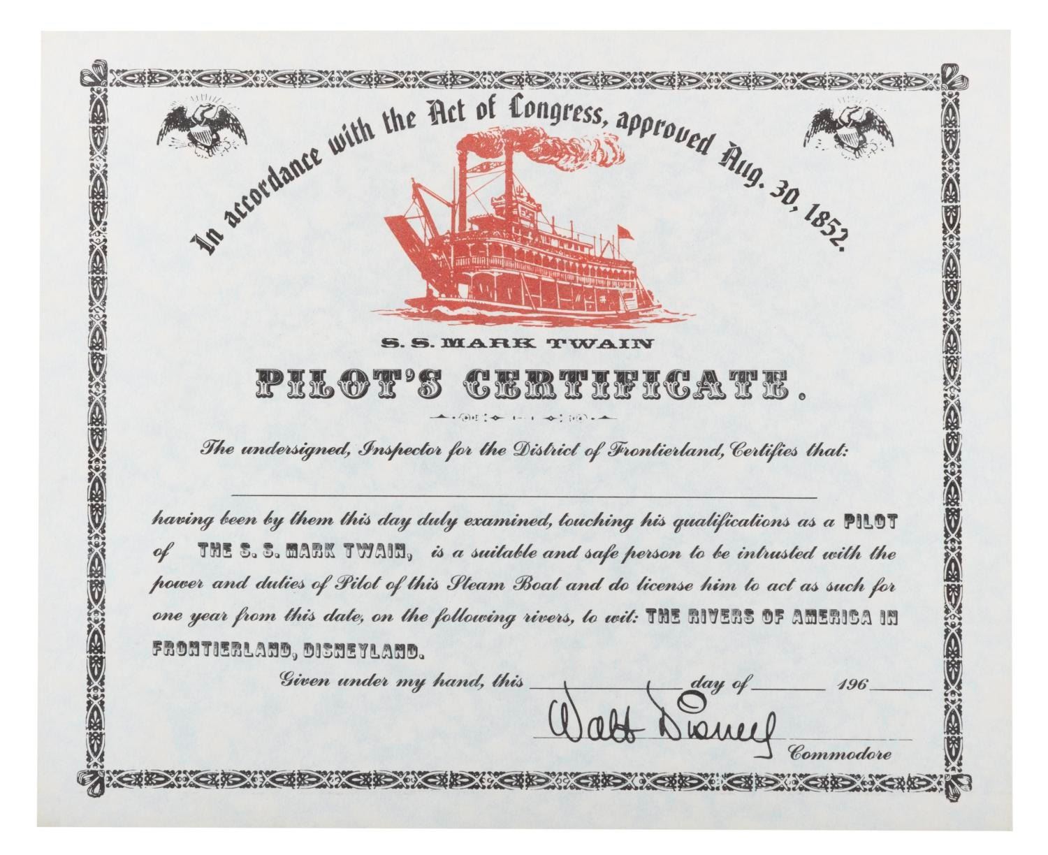 (Disneyland, 1980s) A Mark Twain Pilot’s Certificate assuring the bearer is "a suitable and safe person to be entrusted with the power and duties of Pilot of this Steamboat." This souvenir was given to Guests who visited the Mark Twain Wheelhouse. Measuring 7” x 8.5”, the souvenir is in very good condition with light edge wear.