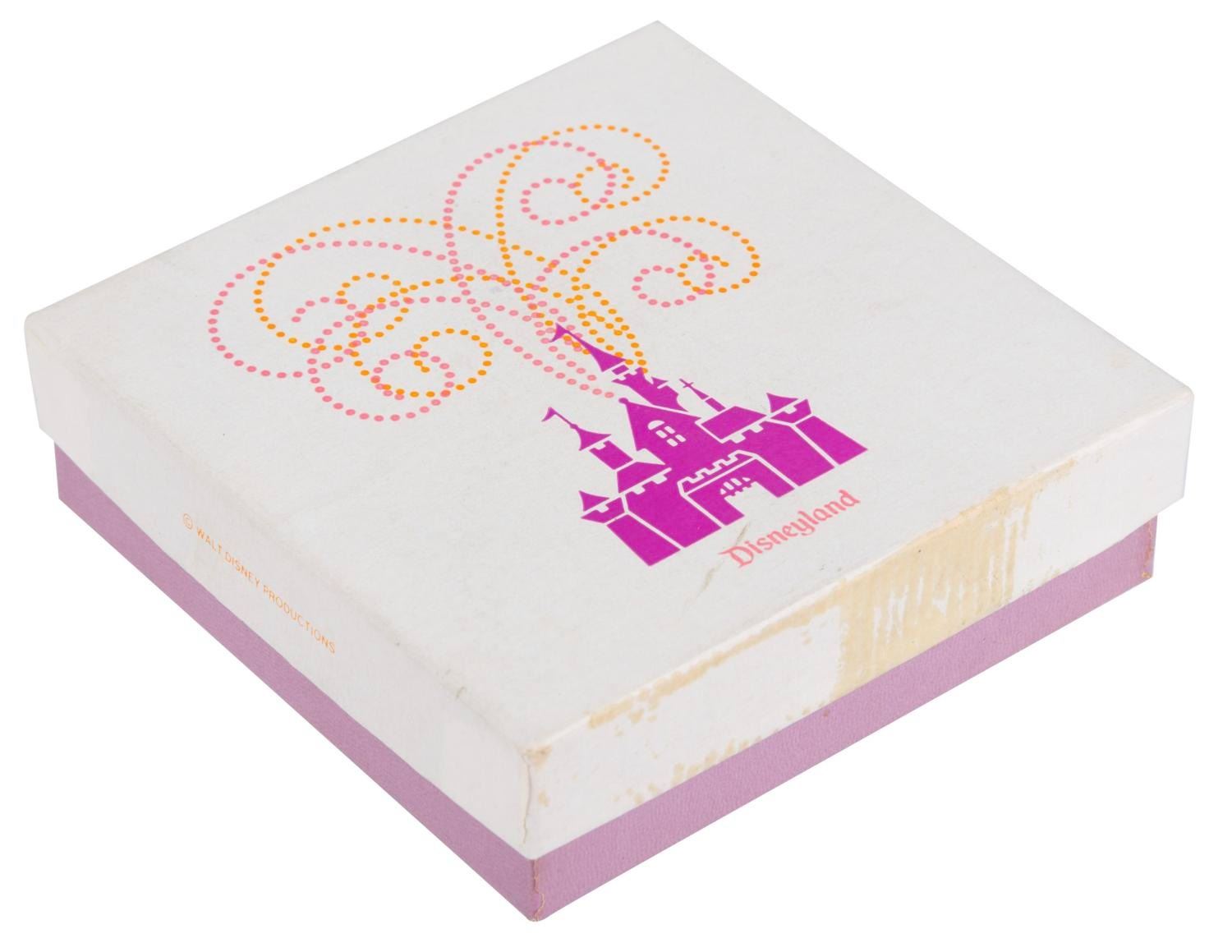 (Disneyland, 1960s-70s) An empty Disneyland gift box featuring a colorful Sleeping Beauty Castle. Measuring 3.75” x 3.75”, the square box displays in good condition with scratches, scuffs, creases, and wear from age.