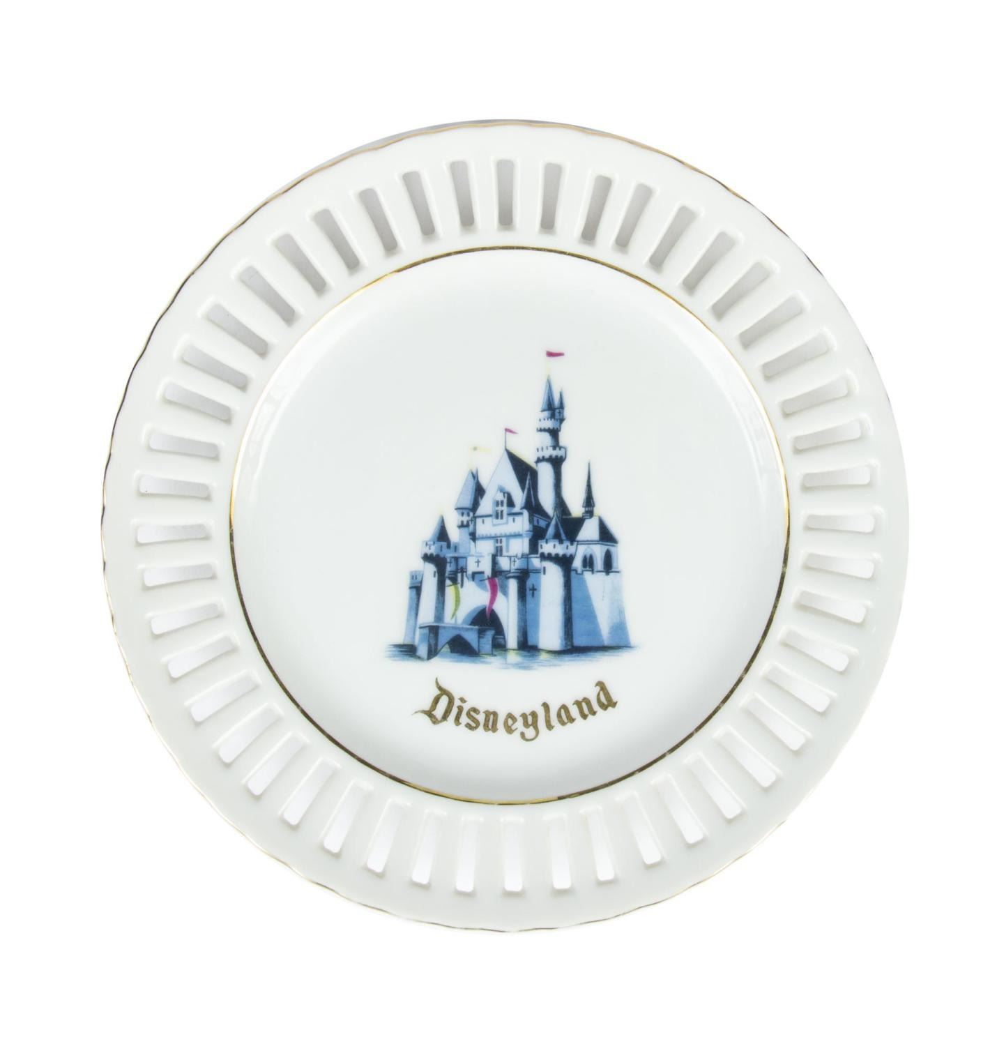 (Disneyland, 1960s-70s) A souvenir decorative plate featuring a slotted pattern with a gold accent. Measuring 7.25" in diameter, the plate is in very good condition with light wear.