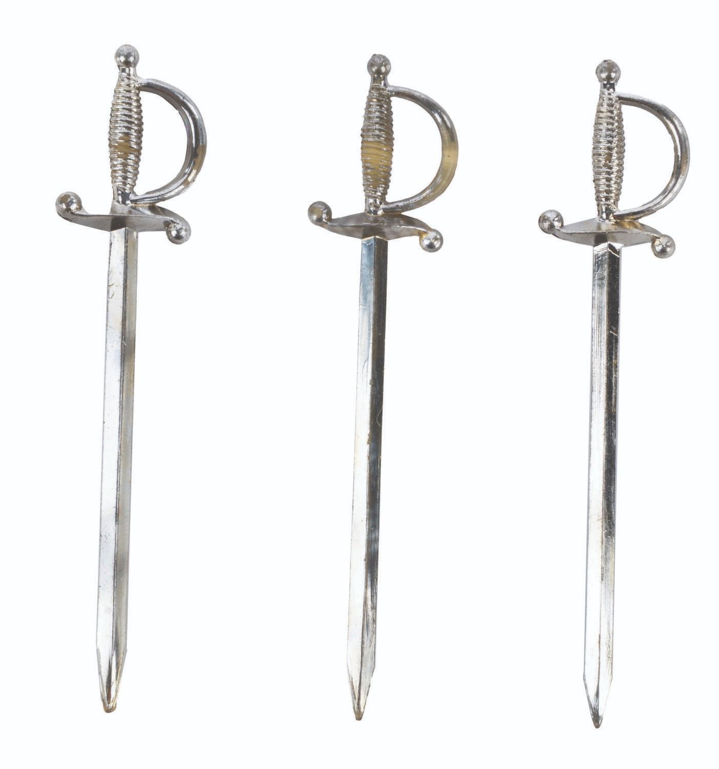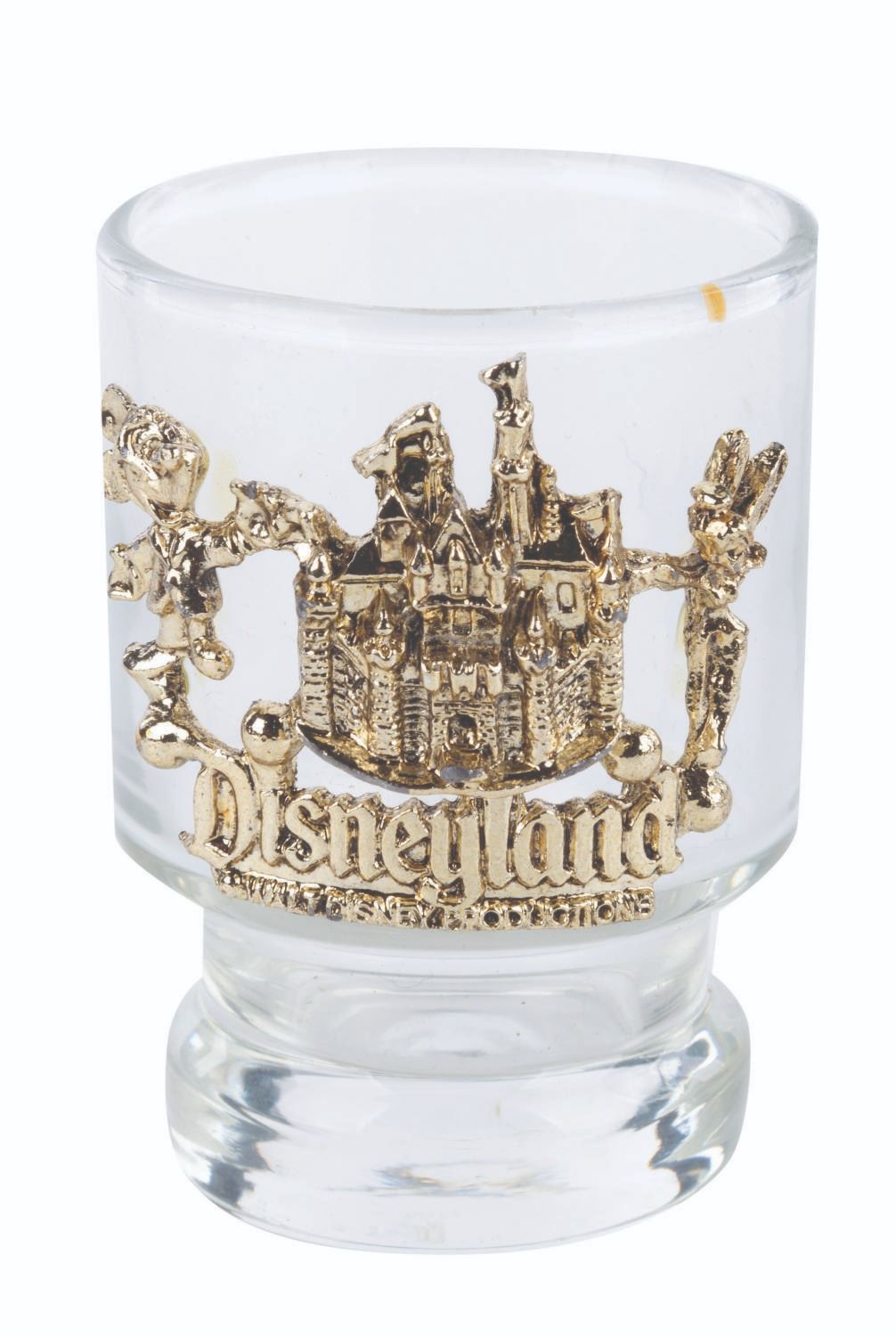 (Disneyland, 1960s) A small souvenir glass with three metal "sword" olive picks. Measuring 2.75" tall and 2.25" in diameter, this vintage souvenir is in fine condition.