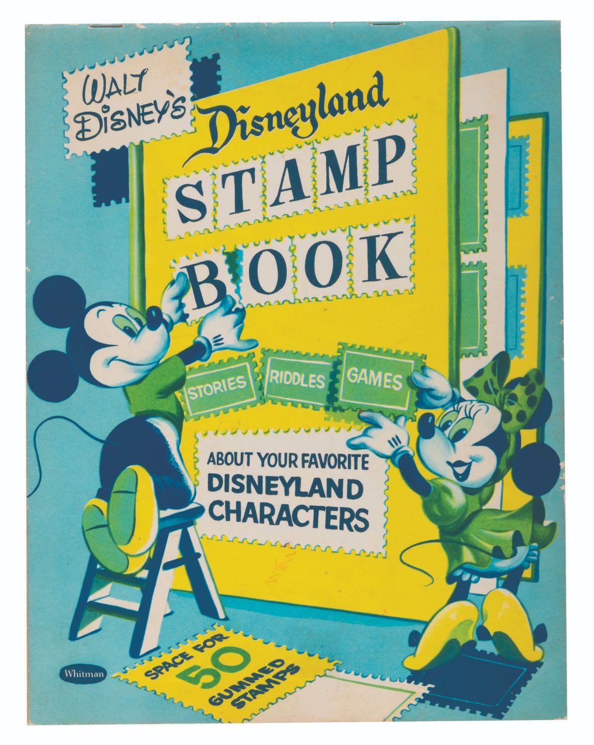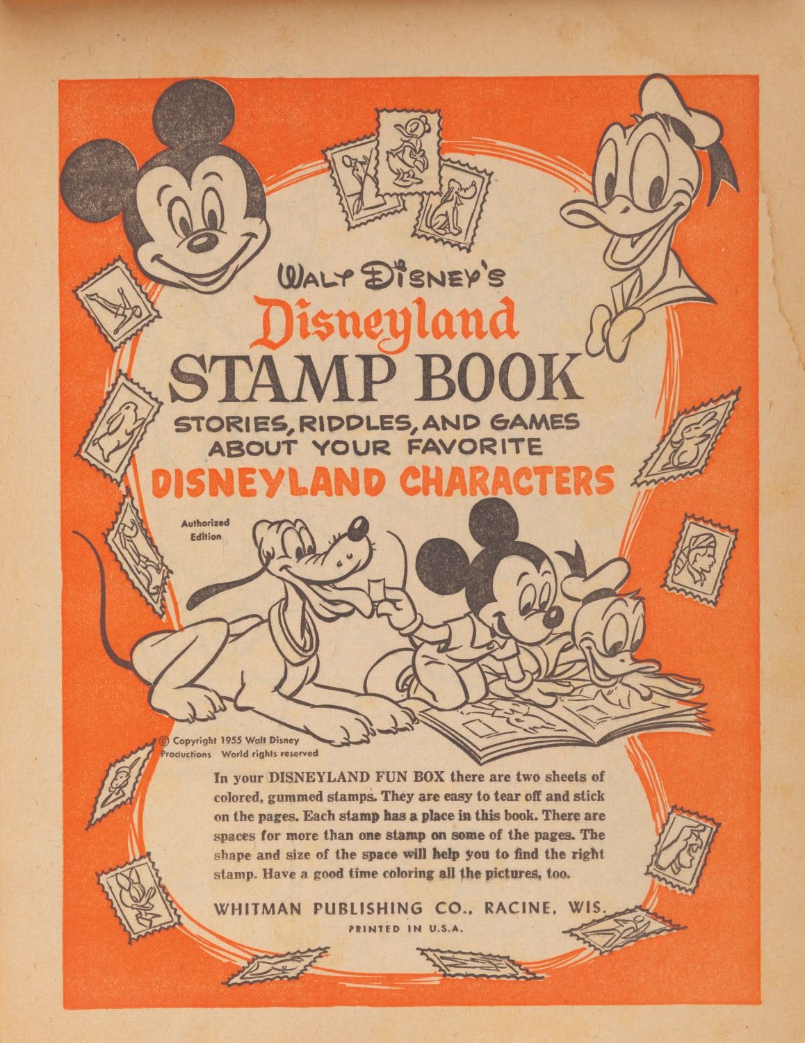 (Whitman, 1955) A Disneyland Stamp Book with stamps, stories, riddles, coloring pages, and games by Whitman. Measuring 8.25” x 11”, the 32-page book is in fair condition with edge wear and creasing, adhesive residue, pages colored and written on with crayon and graphite, used stamps, water stains, light discoloration, and the center pages have detached but are included.
