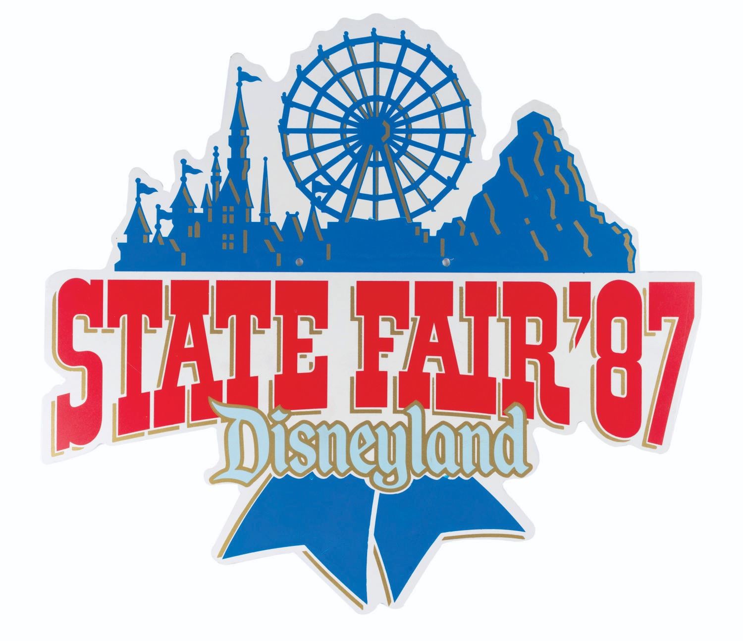 (Disneyland, 1987) A lamppost sign from Disneyland’s first State Fair celebration. Created to boost attendance at the Park, the event featured a large Ferris wheel, fair-style games, food, and Pigmania pig races at Big Thunder Ranch. Measuring 20.25” x 21.5”, the PVC board sign is in very good condition with intended holes for display and typical wear from Park use