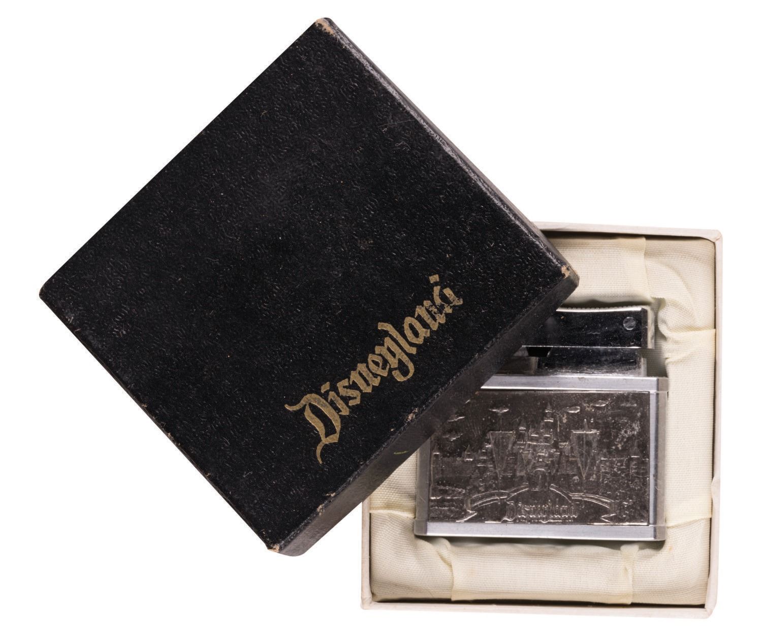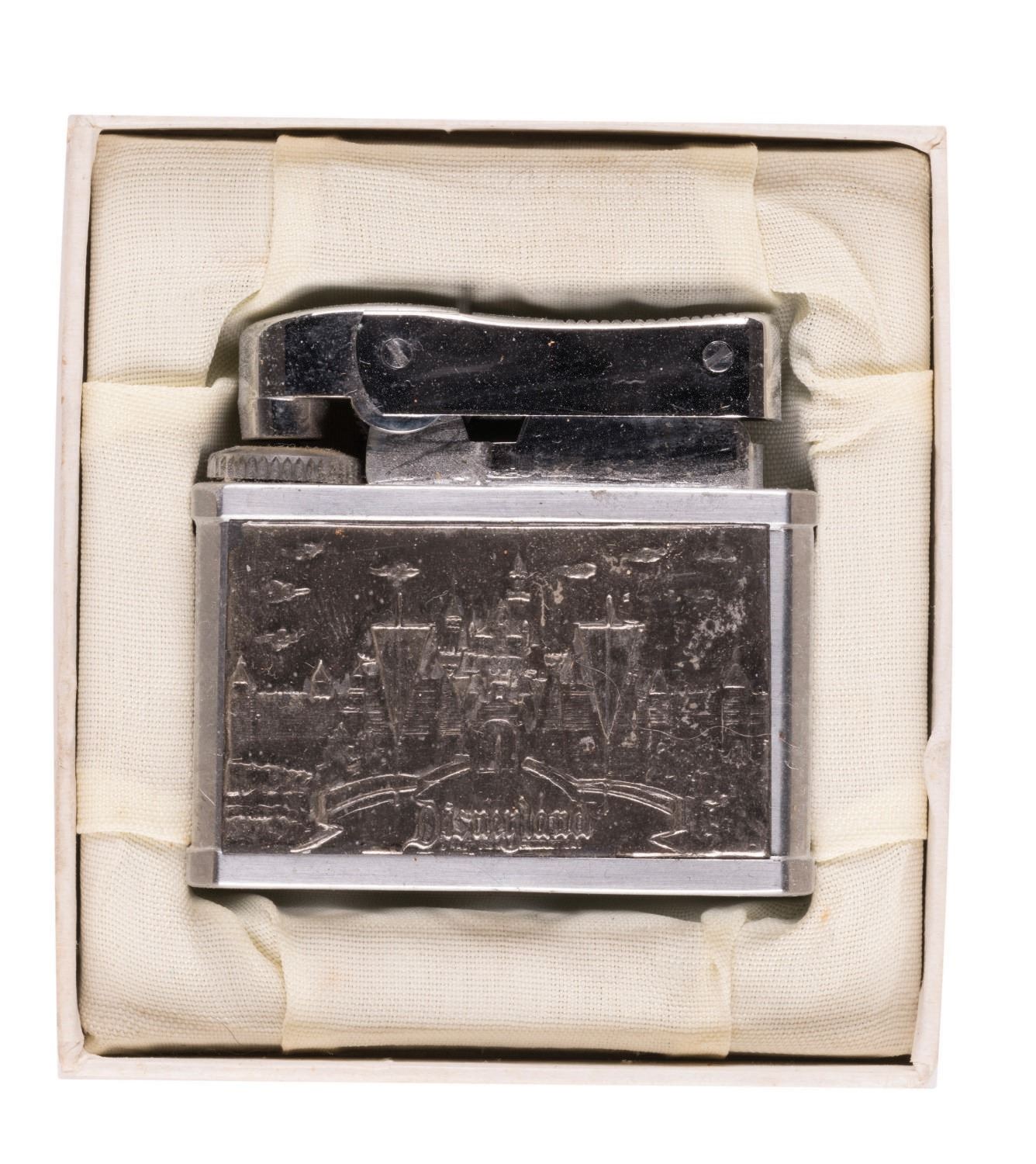 (Disneyland, 1950s-60s) A Disneyland "Super-Lighter" by Brother-Lite in its original Disneyland souvenir box. The vintage 1950s-60s lighter has an image of Sleeping Beauty Castle on each side and was created by Omega of Japan. Lighters like this were sold through Disneyland catalogues and the Main Street Tobacco Shop. The lighter measures approximately 1.75"x1.75" and is in very good condition with the slightest surface wear, while the 2.5"x2.75" good condition box has minor wear to edges and corners.