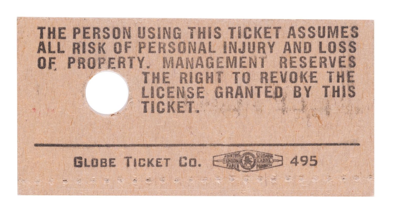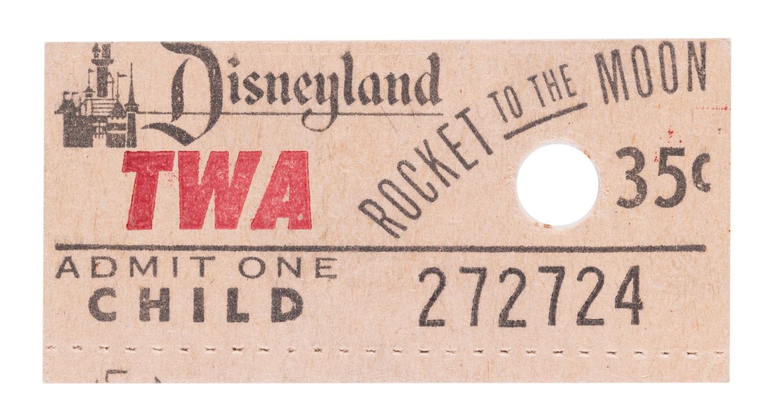 (Disneyland, 1950s) A rare ticket booth ticket for the Rocket to the Moon attraction at Disneyland. This mid-to-late 1950s globe admission ticket has admission value of 35 cents, was purchased from a booth in Tomorrowland and is a rare piece of early Disneyland ephemera. Measuring 2"x1", the ticket numbered "272724" is in fine condition, with a few signs of wear from handling and age.