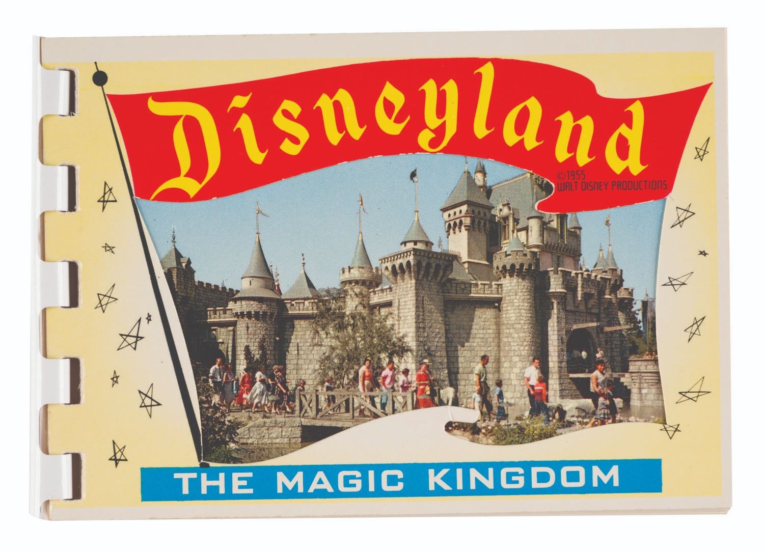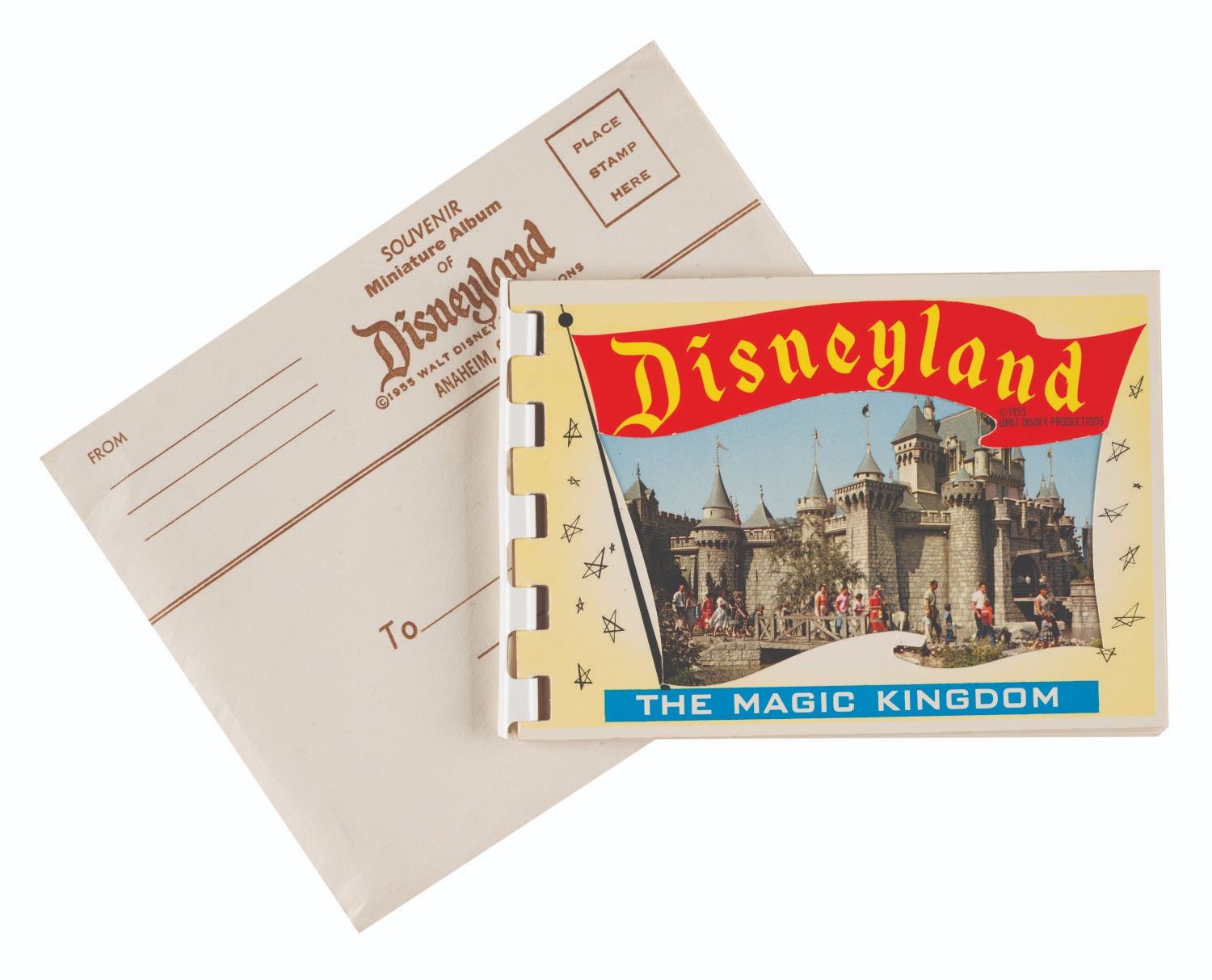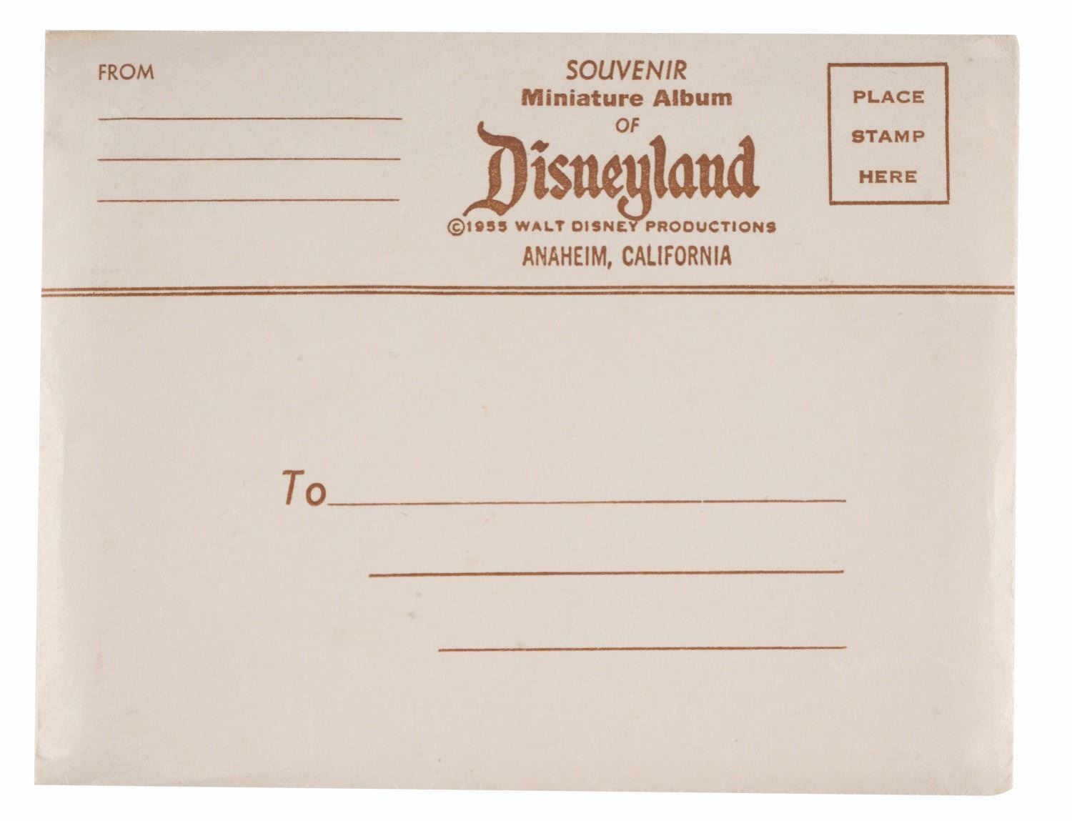 (Disneyland, 1950s-60s) A spiral-bound mini-book featuring 10 full-color glossy photos from around the Magic Kingdom with the original gift mailing envelope. The 2.75” x 4” album and 3.5” x 4.5” envelope are in fine condition with slight discoloration to the envelope from age.