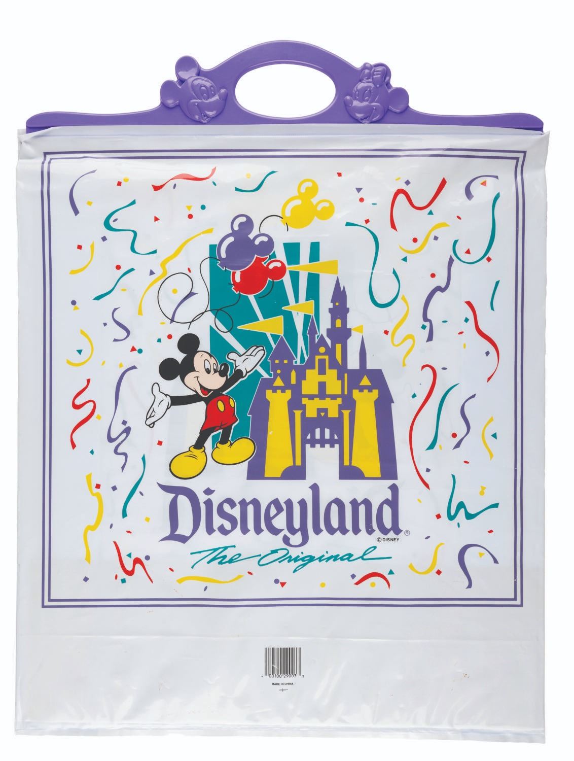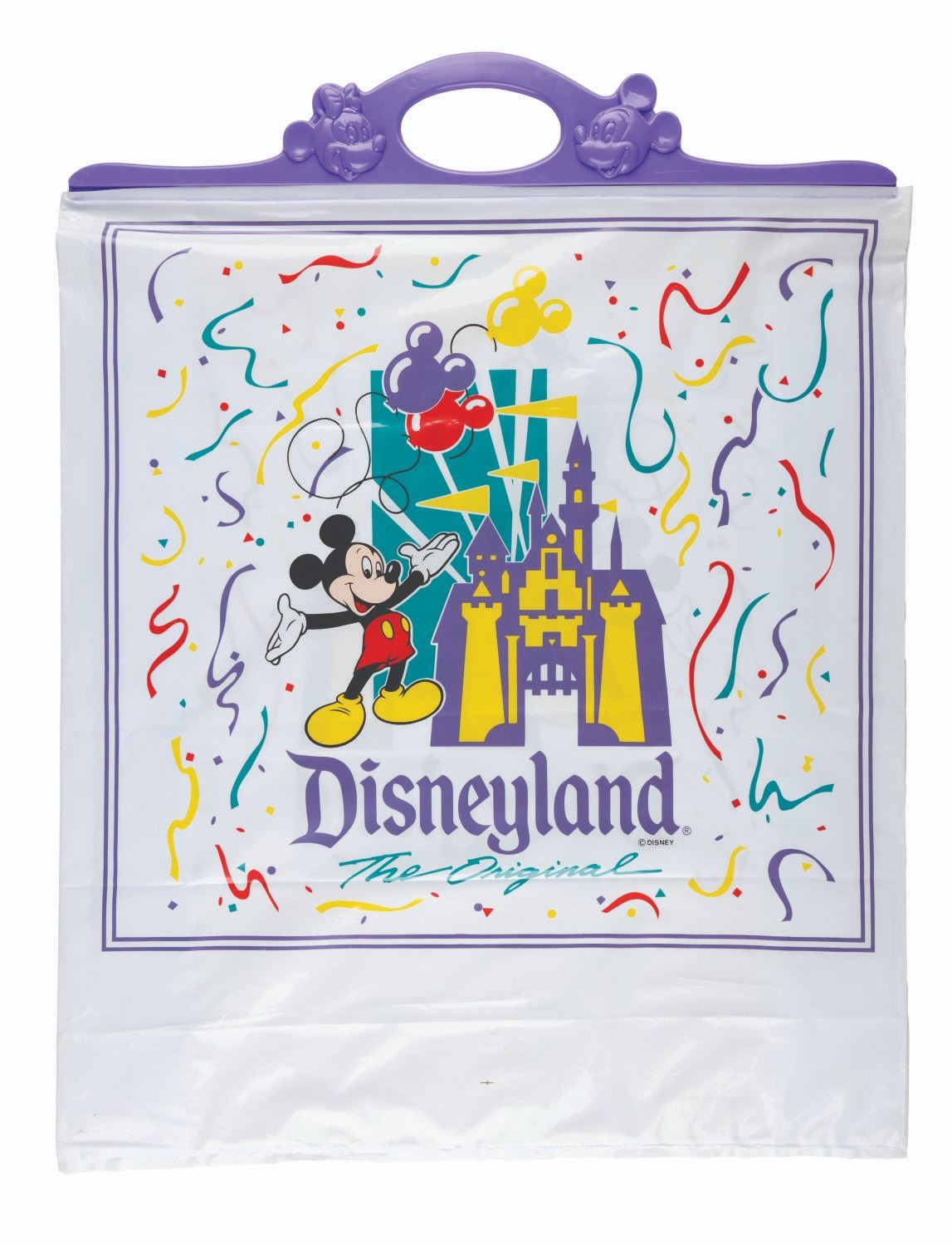 (Disneyland, 1990s) A Disneyland The Original plastic merchandise bag with figural Mickey and Minnie faces in the plastic handle. Measuring 18” x 23.75”, the bag is in very good condition with light handling wear.