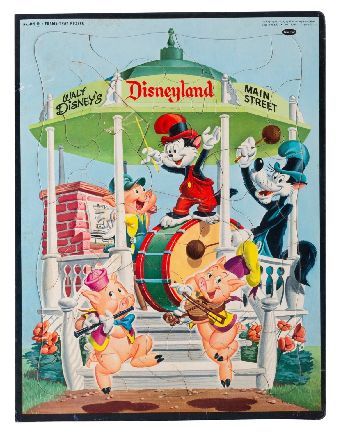 (Whitman, 1955) A Disneyland frame-tray puzzle of the Three Little Pigs, the Big Bad Wolf, and Li’l Bad Wolf playing music under a Main Street, U.S.A. gazebo. Measuring 11.5” x 15”, the puzzle is in good condition with creases, scuffs, soiling, and wear.