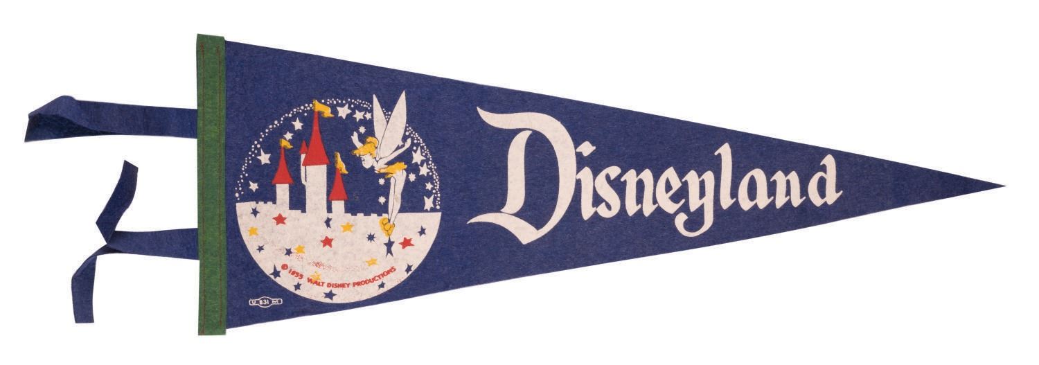 (Disneyland, 1955) A charming early Disneyland souvenir blue pennant. The felt pennant features screen printed graphics of the classic Disneyland text logo and large image of Tinker Bell flying over Sleeping Beauty Castle. Measuring 24.75" long, the souvenir is in very good condition with softening from age, minor creases, and light surface wear.