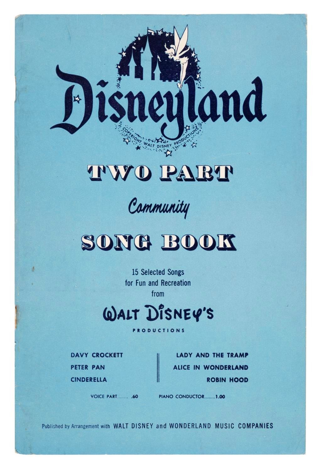 (Hansen, 1955) A Disneyland Two Part Community Song Book featuring 15 songs from Walt Disney films including "Davy Crockett," "Peter Pan,” “Cinderella,” and more. Measuring 6” x 9”, this 32-page book is in very good condition with heavy oxidation to the staples.