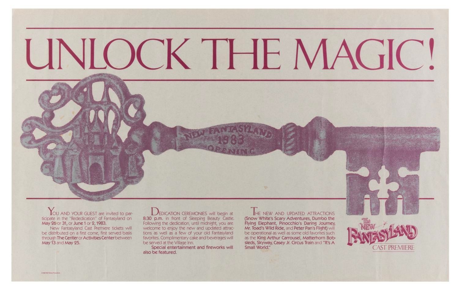 (Disneyland, 1983) An "Unlock the Magic!" poster for the exclusive Cast Member "rededication" of Fantasyland on May 26, 31, or June 1, 2, 1983. Measuring 14.5” x 23”, the poster is in good condition with full vertical folds, light creases, spotting, and edge wear.