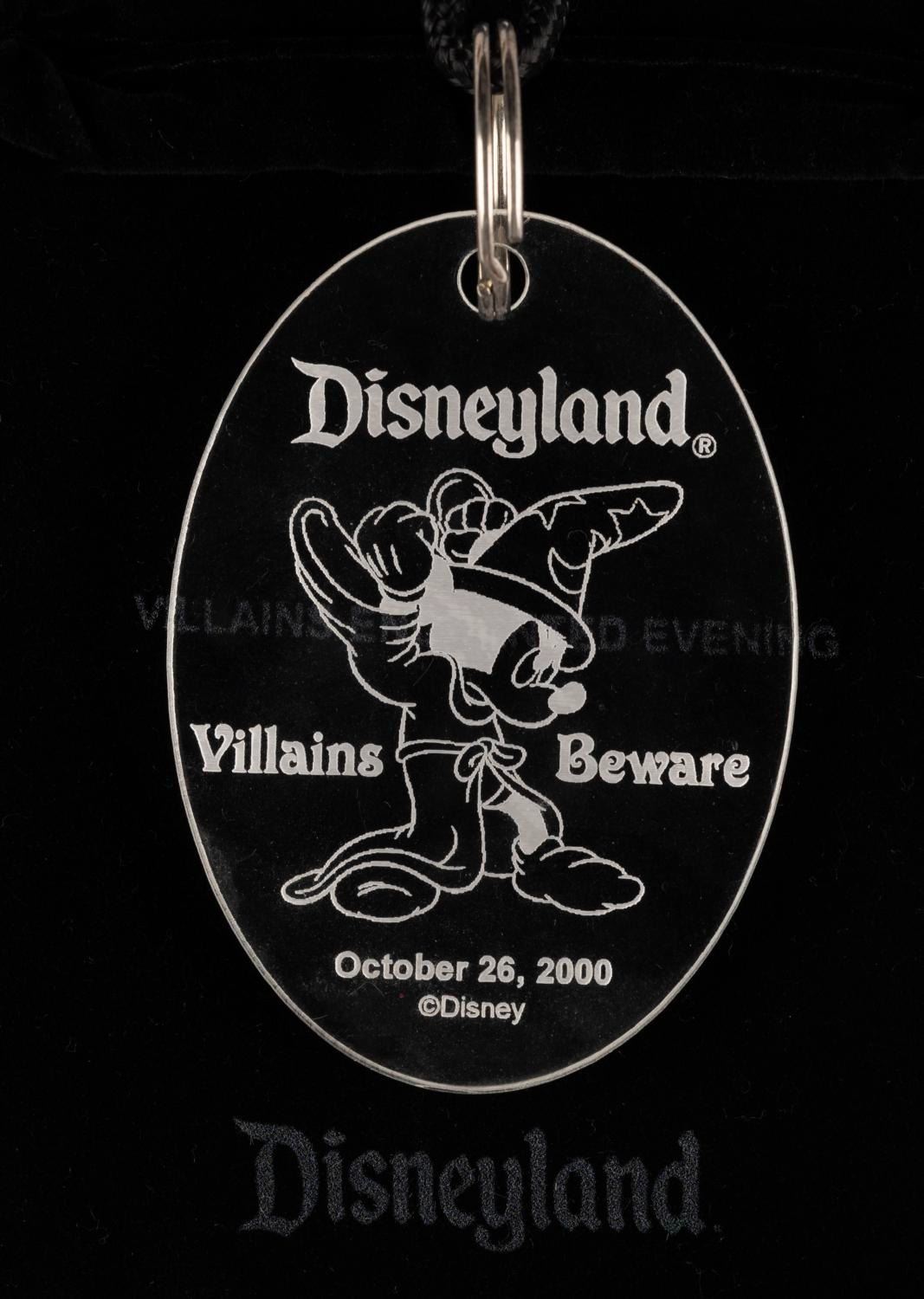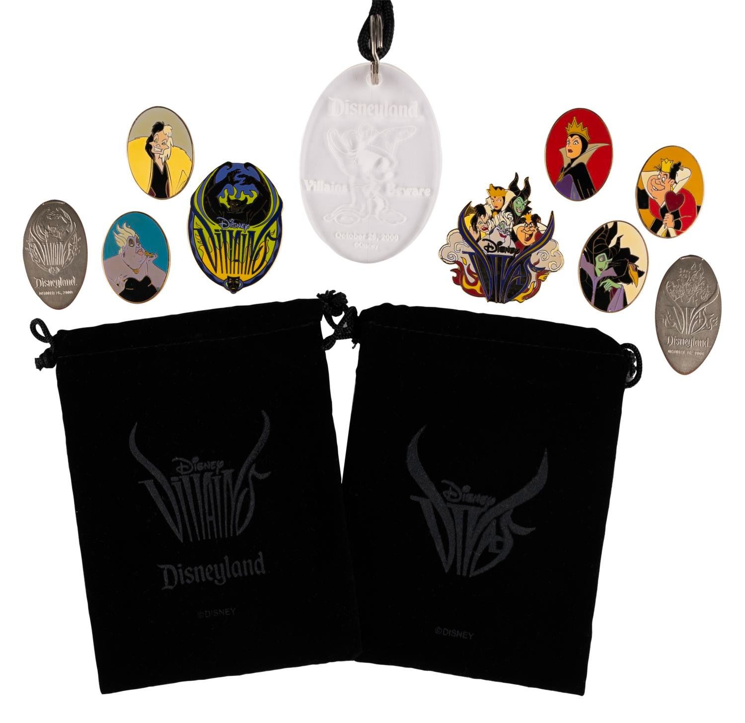 (Disneyland, 2000) A collection of souvenirs from the Disney Divas and Villains event held on October 26, 2000. Included are a pair of event-exclusive pins with velvet pouches reading "Divas" and "Villains," five oval pins featuring the Evil Queen, Ursula, Cruella De Vil, Maleficent, and the Queen of Hearts, two pressed coins, a plastic lanyard, and a punch card. The collection is in very good condition, with the punch card showing typical handling wear.