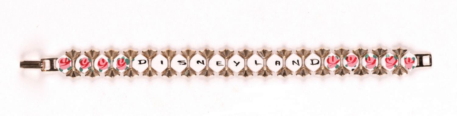 (Disneyland, 1950s-1960s) A hand-painted metal bracelet from the earliest years of the Park. "Disneyland" is spelled out across the middle links, with roses painted on the rest. Measuring 7.5" long, the bracelet is in fine condition.