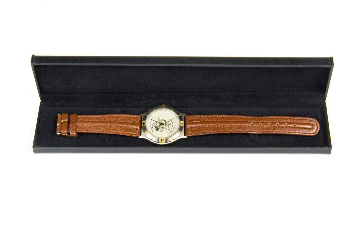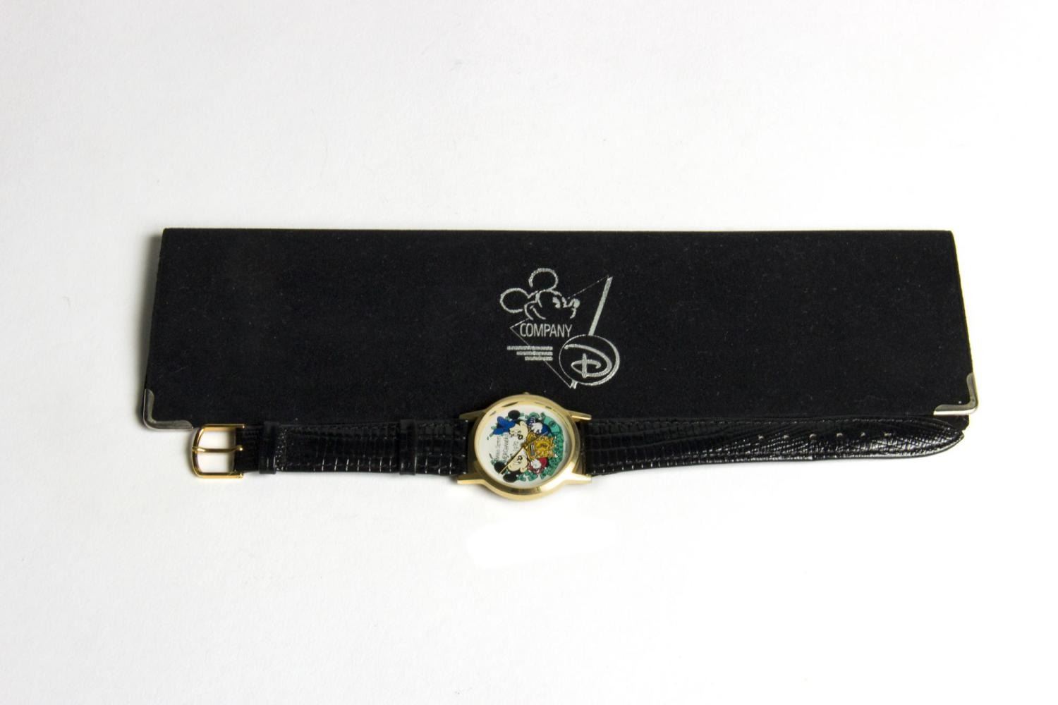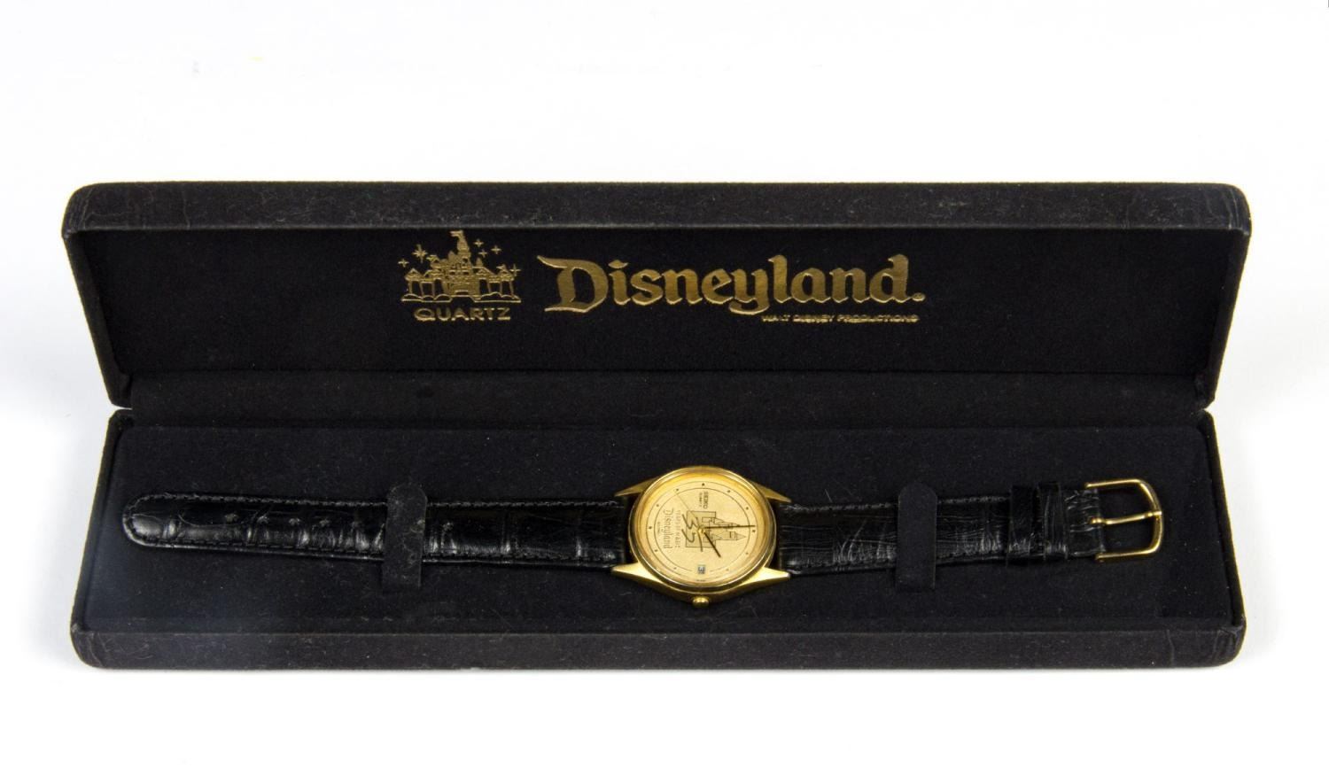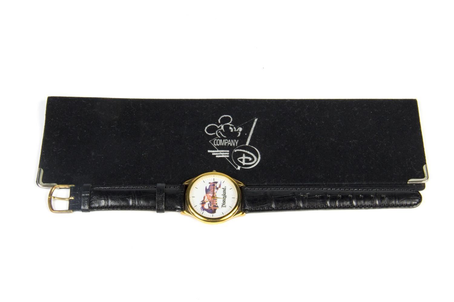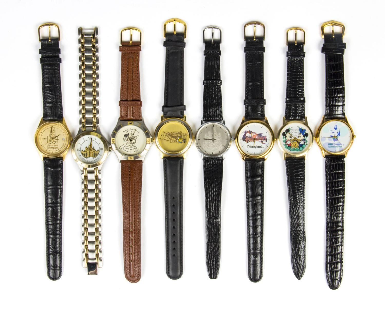 (Disneyland, 1980-1995) A collection of eight Disneyland wristwatches with the original hard and soft cases. Included are a limited edition 1992 Davy Crockett Explorer Canoes watch, a 1992 Main Street Merchandise watch, a Fantasmic! watch, a Sleeping Beauty Castle watch, a CHOC/Disneyland Community Walk watch, and 25th, 35th, and 40th-anniversary watches. The watch faces range in size from 1.25” to 1.5” in diameter, while the bands range from 8.75” to 9.5” long. All are in good to very good condition with creases and light wear.
