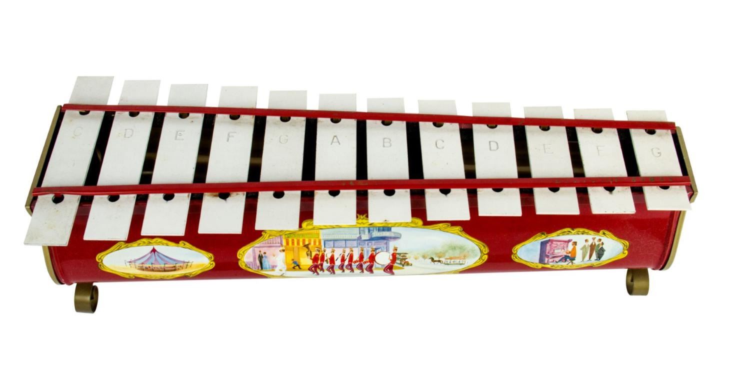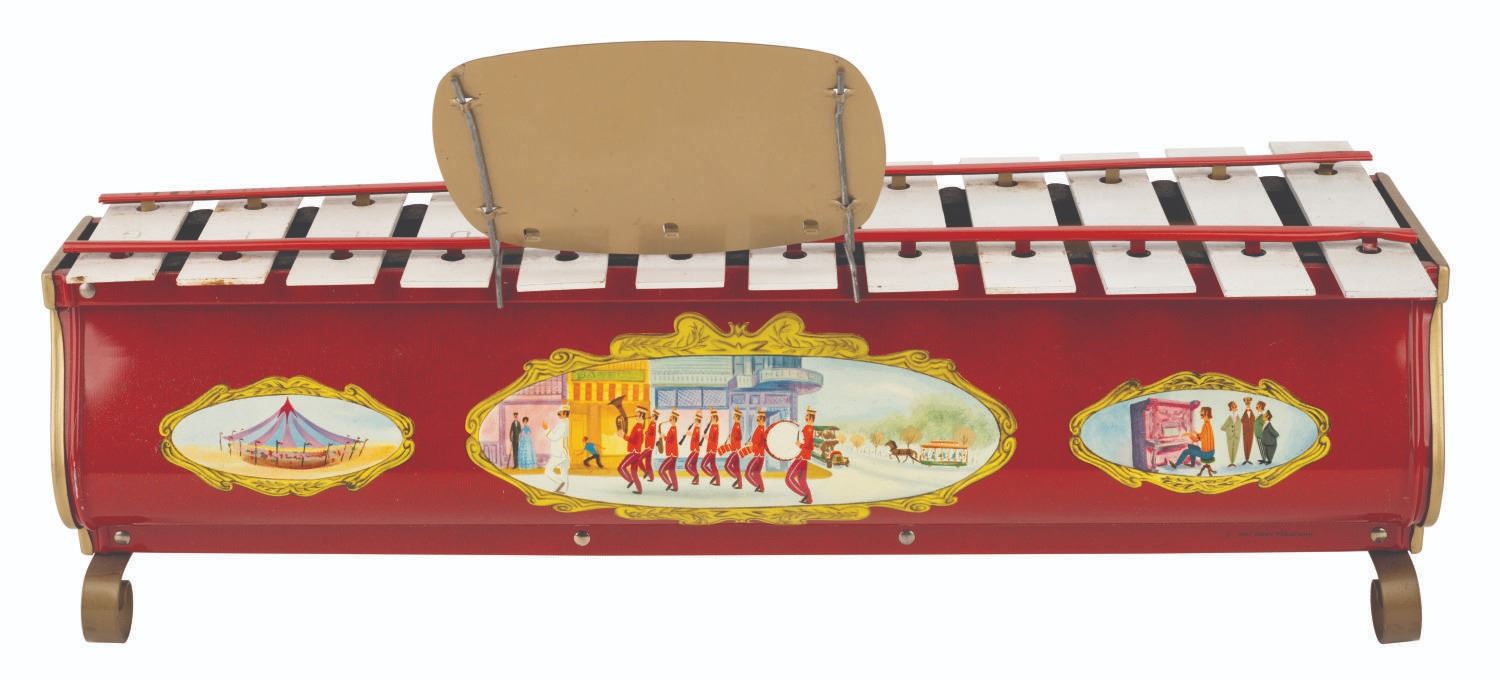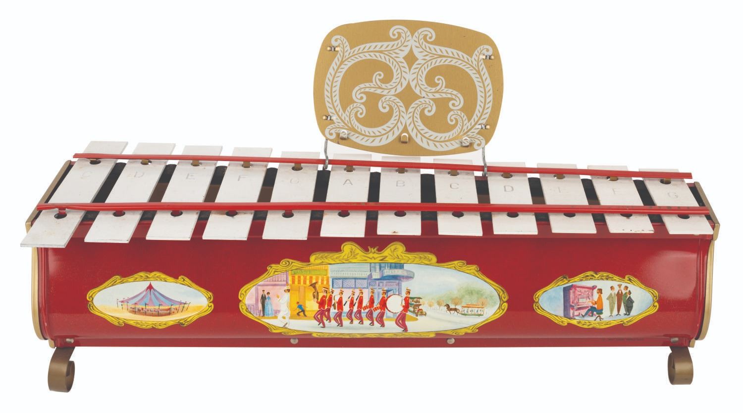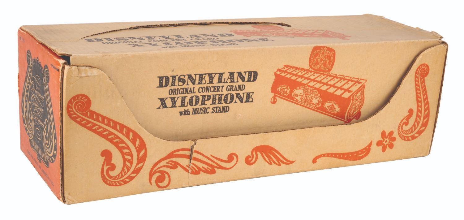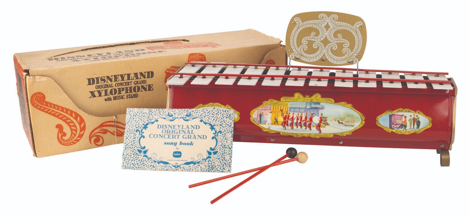 (Disneyland/Tudor, 1961) A Disneyland Original Concert Grand Xylophone with music stand by Tudor Metal Products Corp. The xylophone includes two mallets and a songbook and features imagery of King Arthur Carrousel, the Disneyland Marching Band, and the Main Street Pianist. Measuring 18” x 6” x 5”, the xylophone is in very good condition with minor scratches and wear throughout from use. The original box is in very good condition with a few creases, dents, and surface wear.