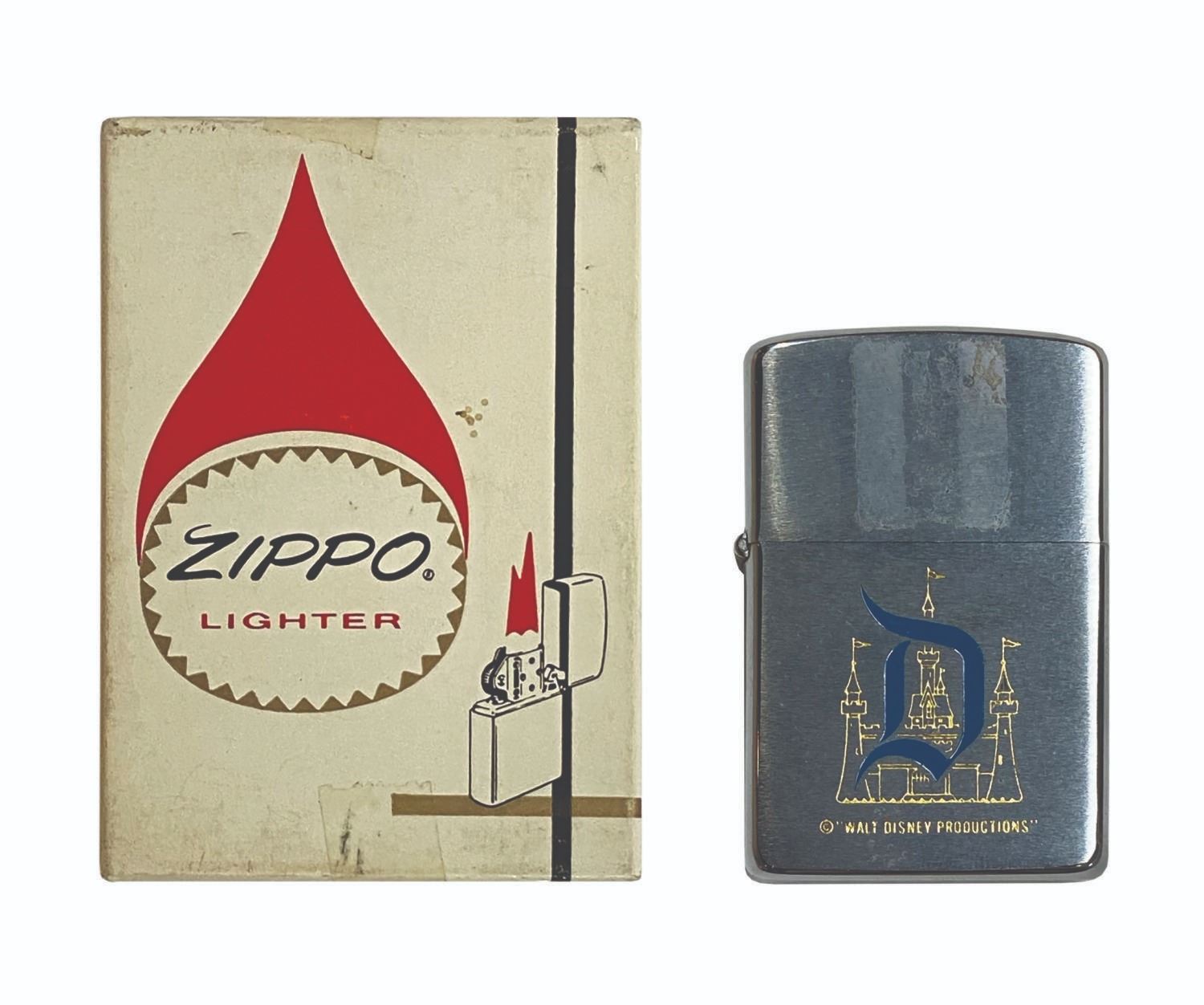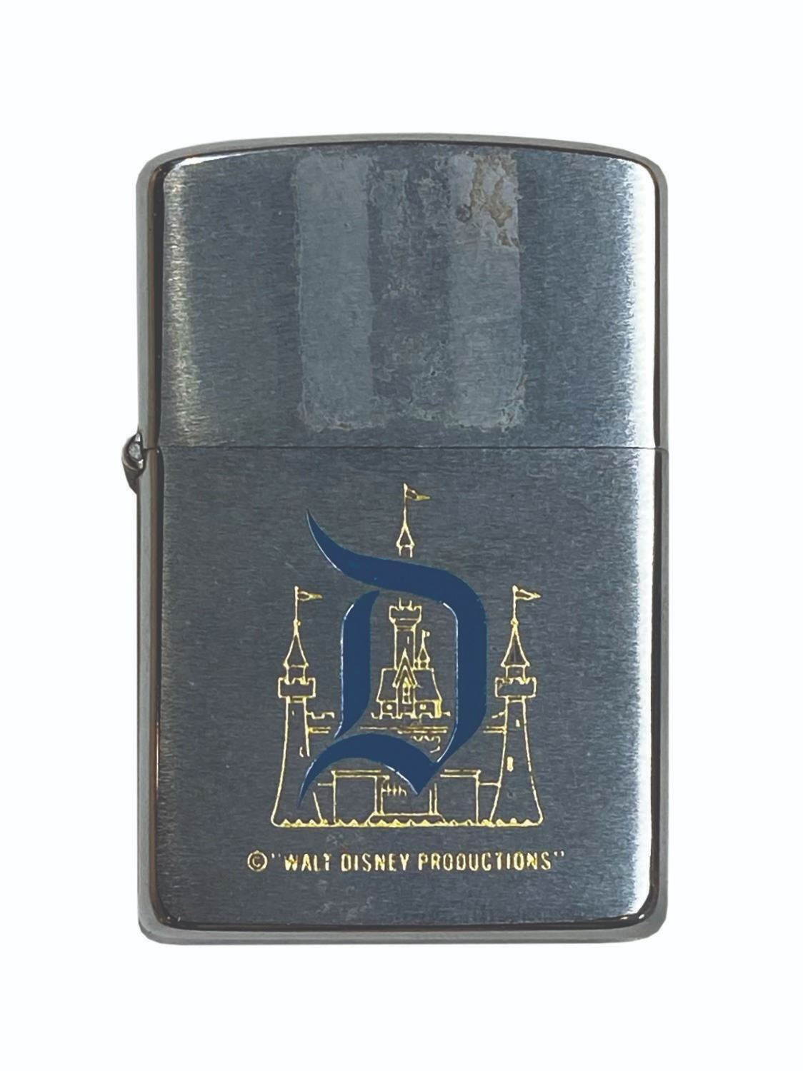 (Disneyland, 1960s) A brushed chrome Disneyland Zippo lighter engraved with the iconic Disneyland "D" atop Sleeping Beauty's Castle. Measuring 2.25” x 1.5”, the lighter comes in its original 3.25” x 2.25” Zippo box. The condition is very good with minor wear, including some residue on the front from a sticker and a few spots of residue on the reverse. The box includes the Zippo instructions and is in good condition with some surface wear, including peeling and general wear from age.