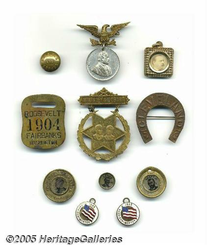 <B>A Diverse Group of Eleven Early Campaign Items</B></I> Group includes one Breckinridge and two Grant ferrotypes, all imperfect, a choice Grant medal/badge, a choice Cleveland/Thurman locket (both photos great), two enameled 1888 Harrison charms, a "Garfield and Arthur" clothing button, "Cleveland" brass horseshoe pin, McKinley-Hobart brass jugate badge, and 1904 Theodore Roosevelt watch fob. Total individual retail value around $550-$700. Sizes 0.60" to 2", 11 items. Lot:260