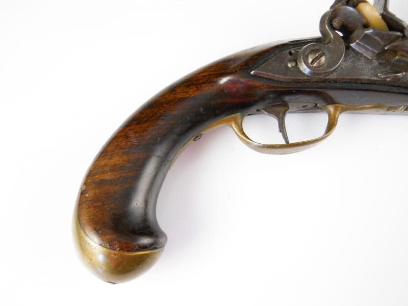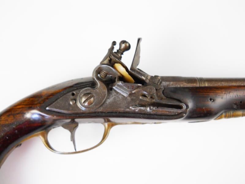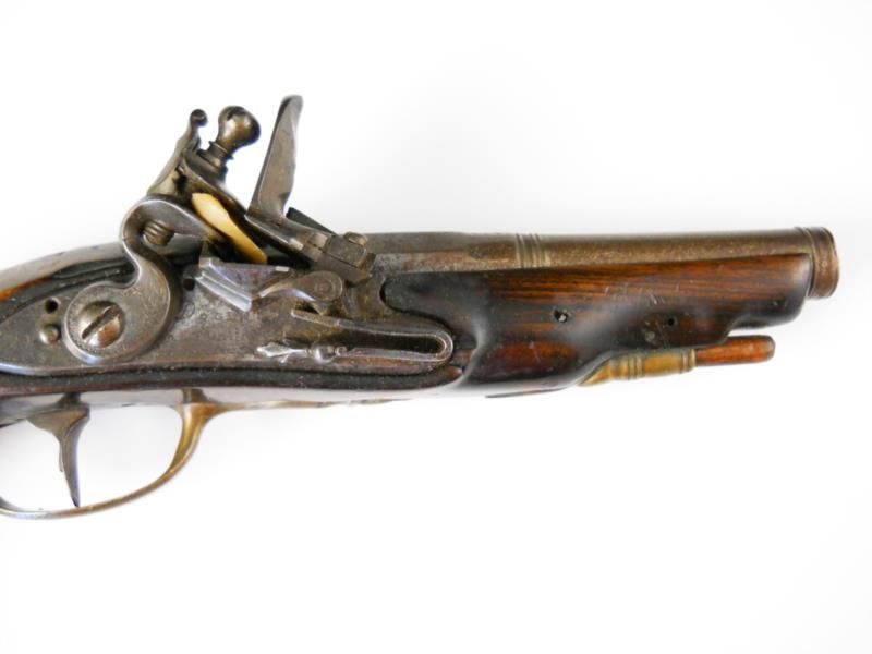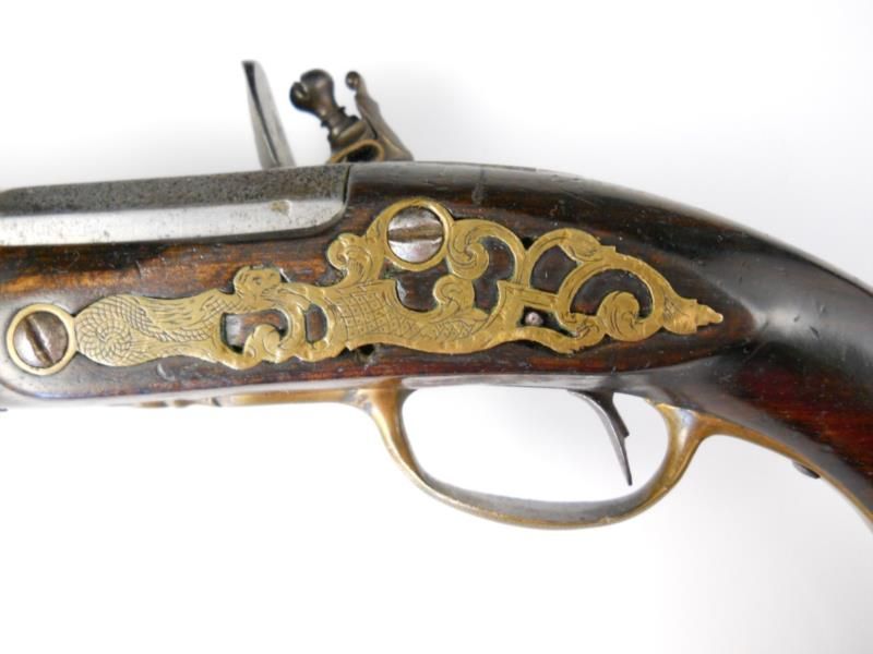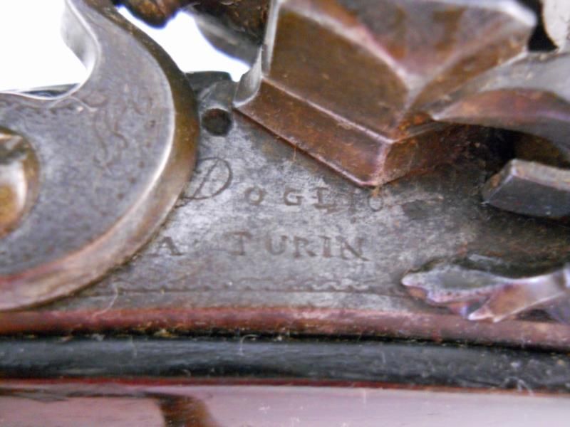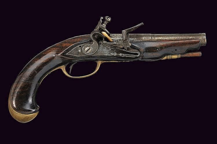 A flintlock pistol by Doglio Smooth, three-stage, 11 mm cal. barrel with ring at the girdle and the nozzle; lock marked "Doglio A Turin"; wooden full stock with brass mounts, pierced and engraved counter-plate; wooden ramrod. _dimensions: length 25