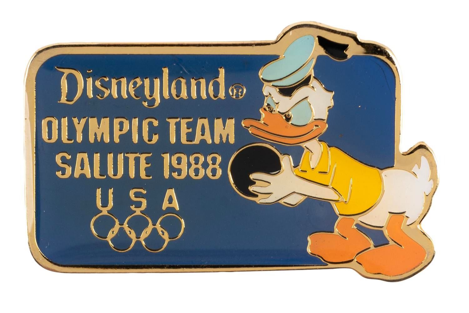 (Disneyland, 1988) A Disneyland Olympic Team Salute 1988 pin, featuring Donald Duck bowling. Measuring 1.5” wide, the pin is in very good condition with color shift from age.