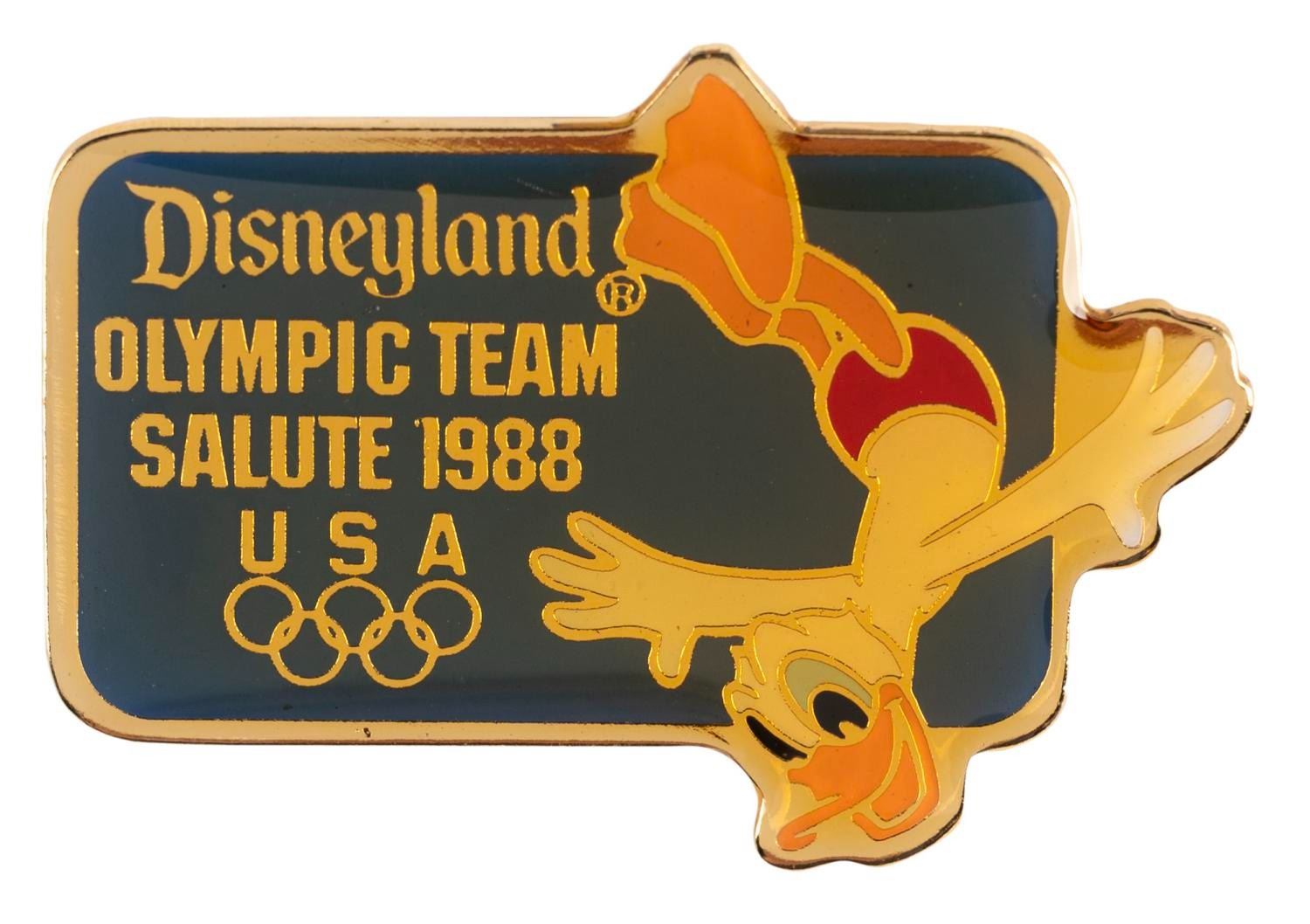 (Disneyland, 1988) A Disneyland Olympic Team Salute 1988 pin, featuring Donald Duck diving. Measuring 1.5” wide, the pin is in very good condition with color shift from age.