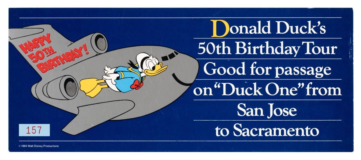 (Disney, 1984) A voucher good for passage from San Jose to Sacramento aboard the plane "Duck One" during Donald Duck's 50th Birthday Tour. Measuring 3.5" x 8.5", the voucher is in very good condition with light handling wear including small scuffs to some edges.