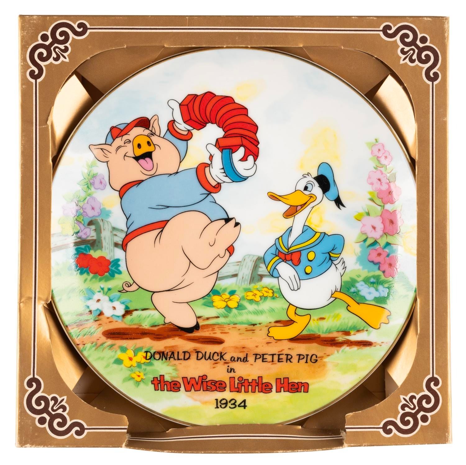 (Disney, 1984) A decorative plate commemorating Donald Duck's 50th birthday featuring Donald’s screen debut in 1934’s “Wise Little Hen.” Measuring 6.25” in diameter, the plate is in fine condition, with typical light handling wear to the box.