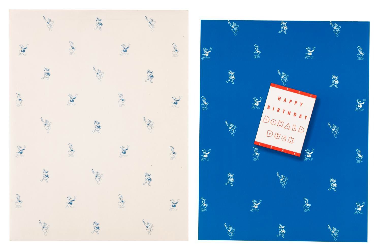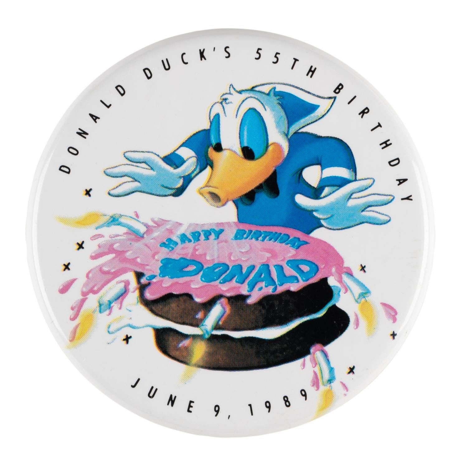 (Walt Disney World, 1989) A Cast Member exclusive print and button commemorating Donald Duck's 55th birthday. The pamphlet and print measures 8.25" x 10.75", and the pinback button measures 2.25" in diameter. Both items are in fine condition with minimal oxidation visible on the reverse of the button.