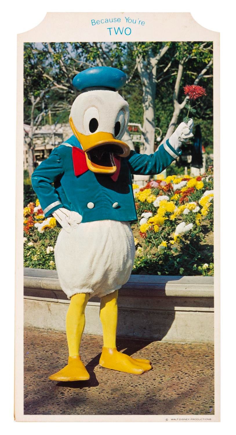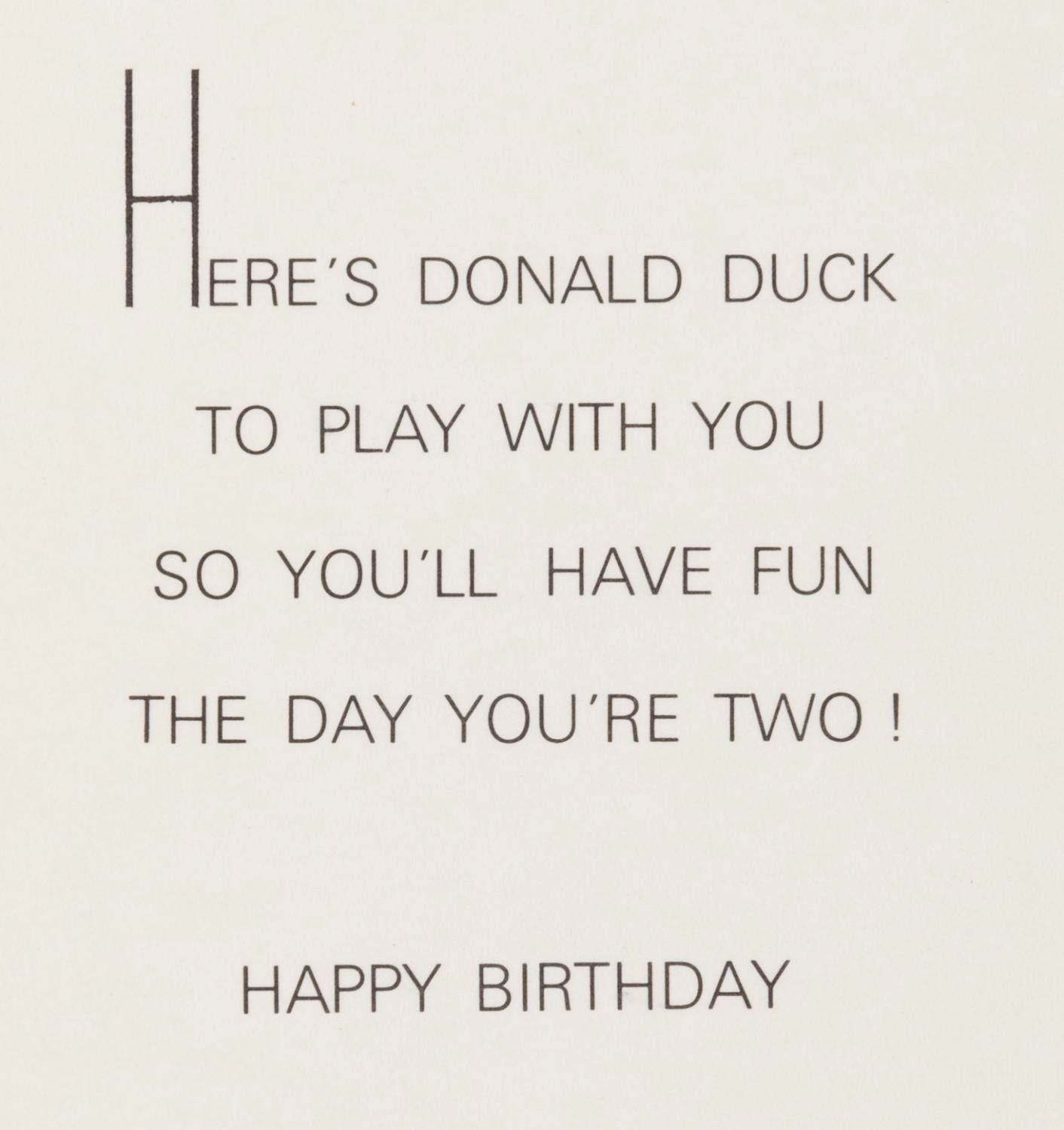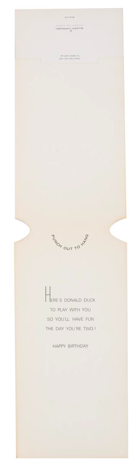 (Buzza Cardozo, 1960s-70s) A Donald Duck stand-up card, intended for a two-year-old. Measuring 5.5" x 11", the embossed card is in very good condition with wear and discoloration from age.