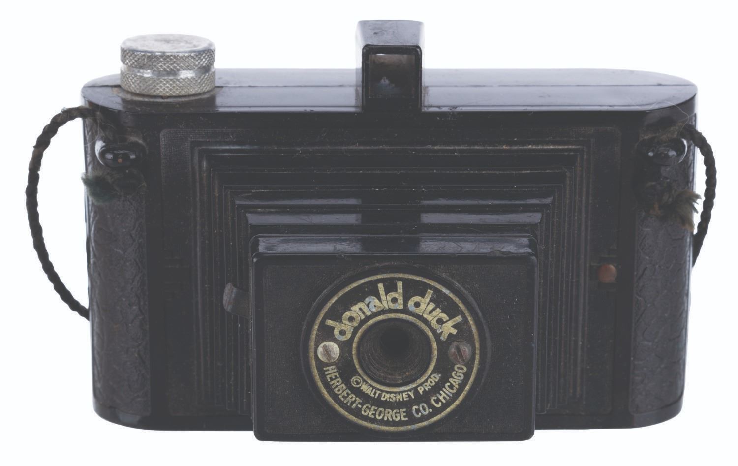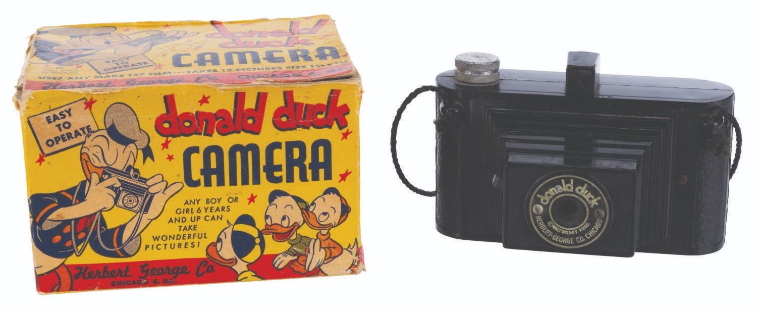 (Herbert George Co., 1946) A Donald Duck camera with the original box and wire neck strap. The hard Bakelite camera body features a molded image of Donald and his nephews on the back. The camera captured 12 exposures to a roll of film using a simple leaf shutter. Measuring 4.5” x 2.75” x 3” tall, the camera is in very good condition with scratches and wear. The 3.5” x 5” x 3” box displays in good condition with separation at the lip, wear, pencil inscriptions on the top, discoloration from age, and creases throughout.