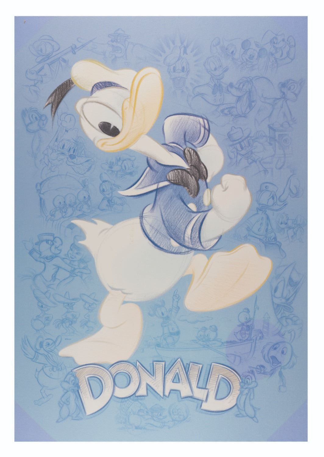 (Disney, 2000s) A Disney Studio Collection canvas print featuring Donald Duck surrounded by sketchbook-style illustrations. Measuring 16" x 23", the art is in good condition, with color fading throughout.