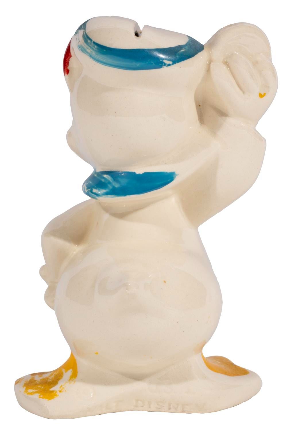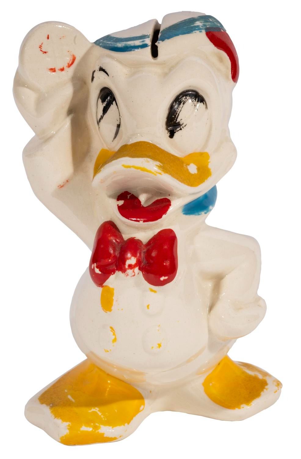 (Leed's 1940s-60s) A Donald Duck ceramic coin bank by Leeds China which held a license for Disney Pottery starting in 1944. Measuring 6.5" tall and 4.25" wide, the bank is in good condition with scuffs, paint chipping crazing, and wear from age throughout.