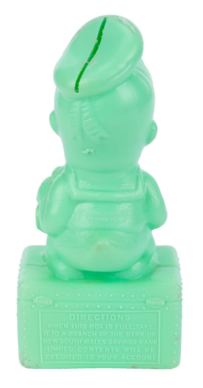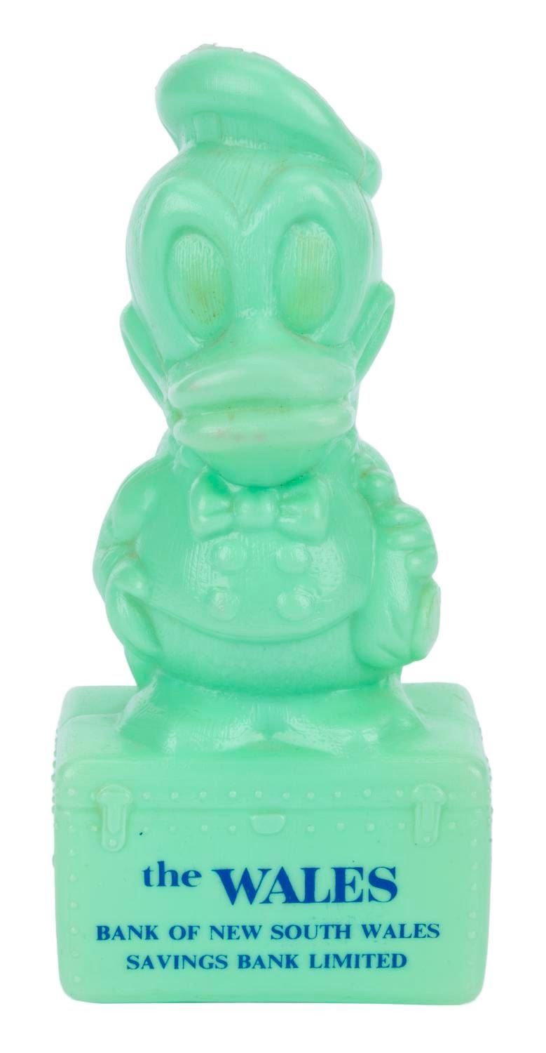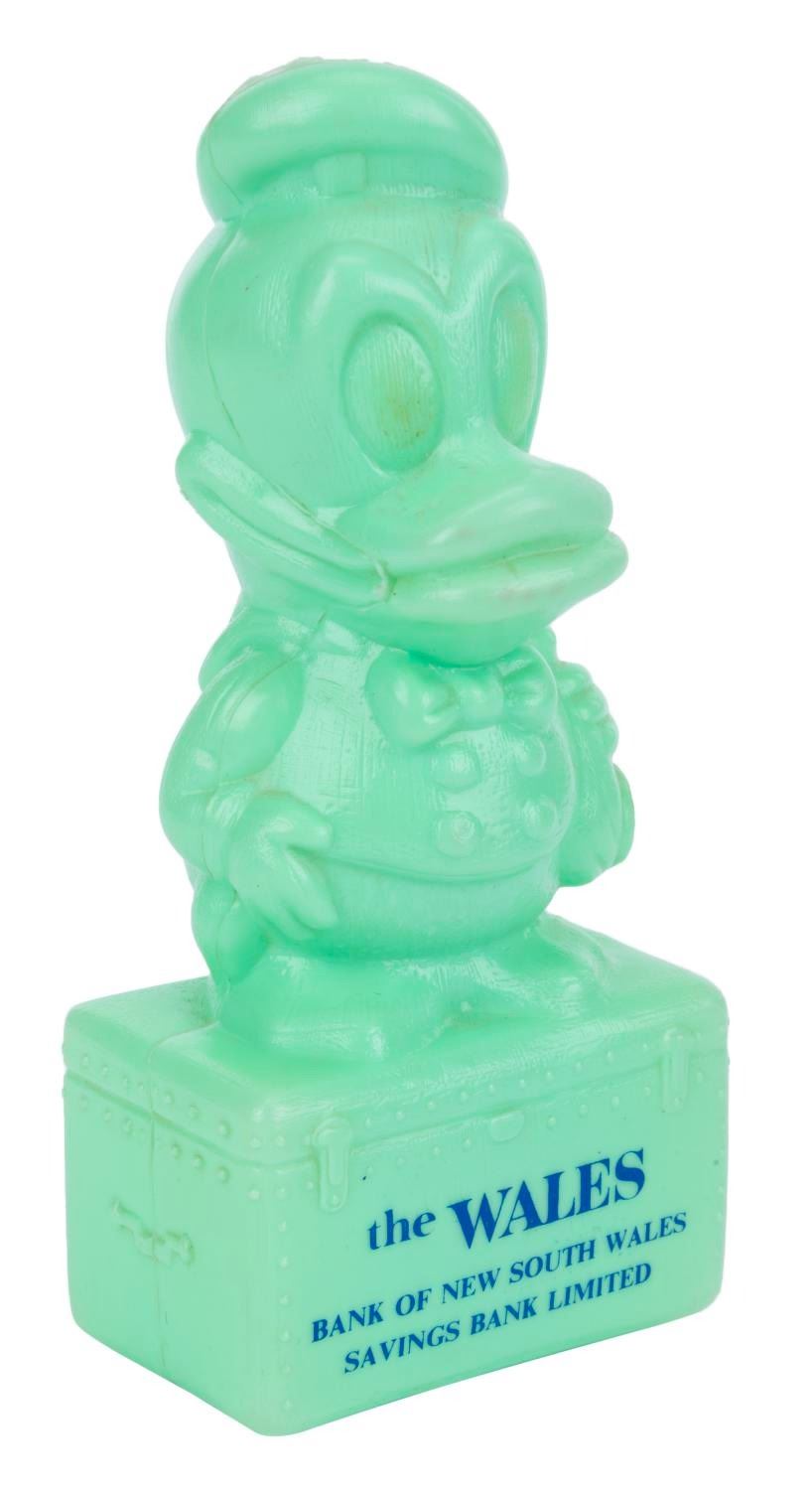 (Bank of New South Wales, 1964) A Donald Duck Coin Bank. By a special arrangement with Walt Disney Productions, the Bank of New South Wales in New Zealand issued this promotional coin bank gift to customers. Measuring 6.75” tall and 3” x 2.75”, this plastic bank is in very good condition with few spots of discoloration, light scuff marks, and minor wear.