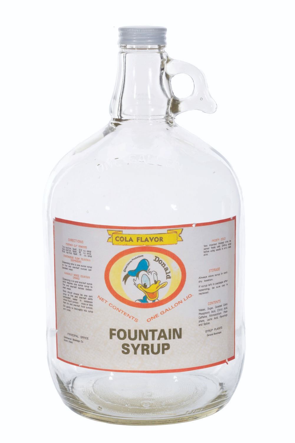 (General Beverages, 1950-60s) An empty one gallon Donald Duck cola flavor fountain syrup jug. Measuring 6” in diameter and 12” tall, the jug is in good condition with stains, scuffs, sugar residue inside, and wear from use.