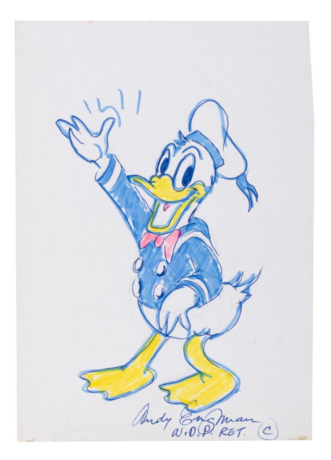 (Engman, 1970s-80s) An ink and marker drawing of Donald Duck by animator Andy Engman, signed on the bottom right corner. Engman is known for his work at Disney, on titles like "Snow White and the Seven Dwarfs," “Pinocchio,” and "The Sorcerer's Apprentice” sequence in “Fantasia.” Measuring 5.75” x 4”, the drawing is in good condition with a very light crease along the top edge.