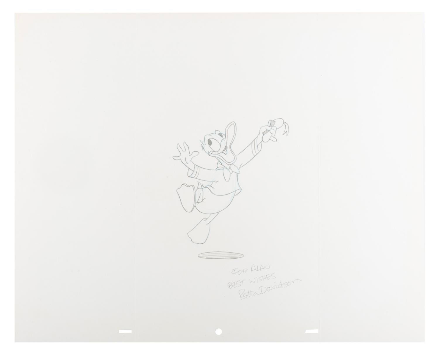 (Davidson, 1970s-80s) A pencil drawing of Donald Duck by Disney animator Retta Davidson, signed with a personalized dedication. When she started, Davidson was one of the few female animators at the Disney Studio. After Disney, she worked on influential projects including Warner Bros. “Duck Dodgers” and “Heavy Metal.” With a character image size of 4.5” x 5.5” on a 12.5” x 15.5” piece of drawing paper, the art is in very good condition with light creases and folds from storage.