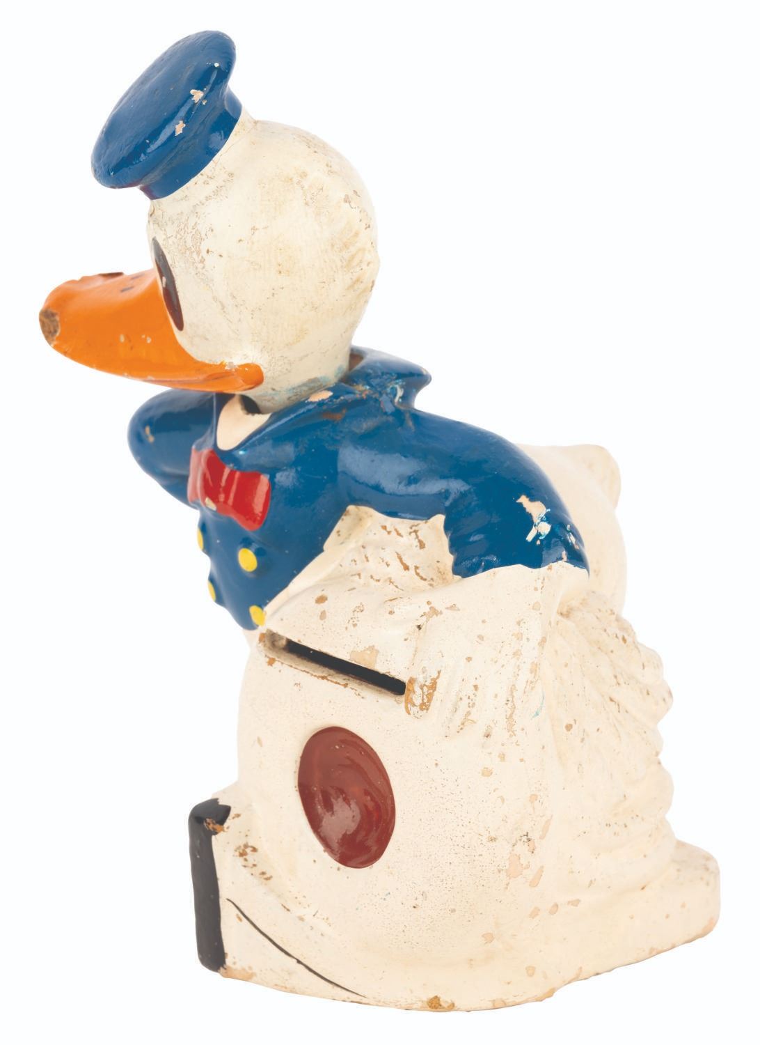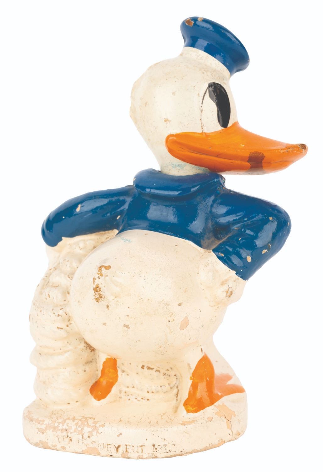 (Crown, 1938) A composition Donald Duck savings bank. Donald has a movable head and features a metal base with a locking panel. Measuring 6" tall, the bank displays in fair to good condition with a broken neck, spots of paint lost, soiling, and a stain on the underside of the beak.