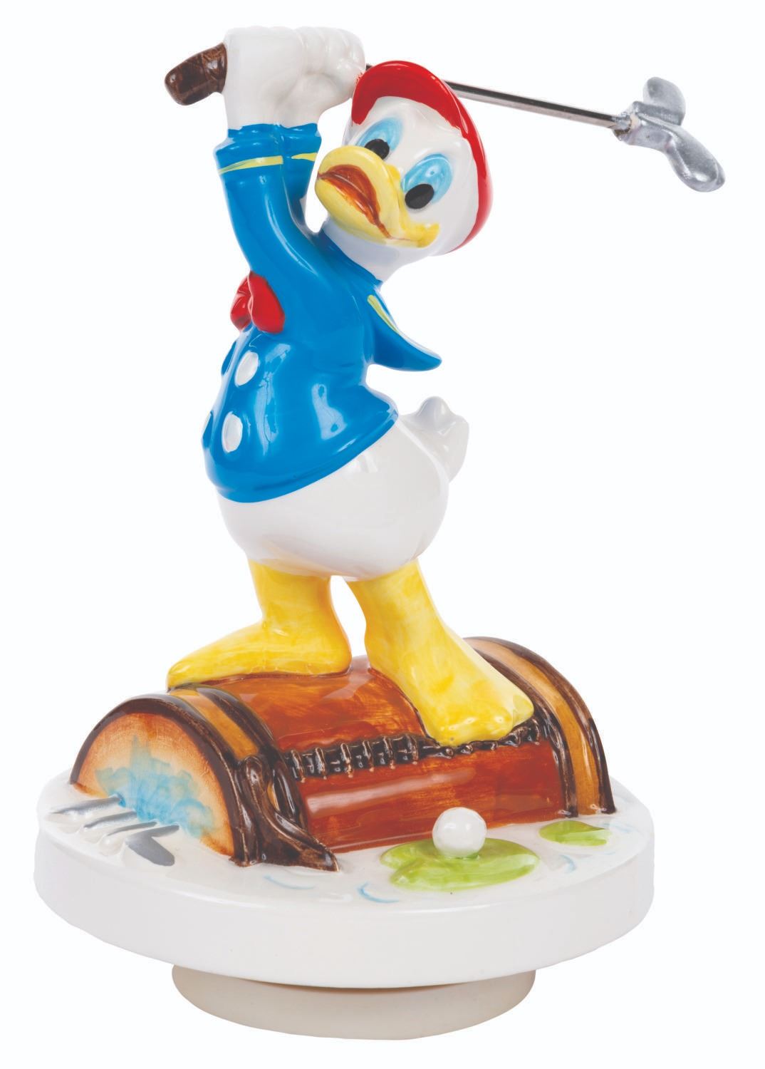 (Schmid, 1980s) A Walt Disney Characters Donald Duck "Music Box" figure. When wound, the mechanized ceramic rotates and plays "I Whistle a Happy Tune" from “The King and I.” Measuring 7.75" tall and 5" in diameter, the hand-painted piece displays in fine condition.