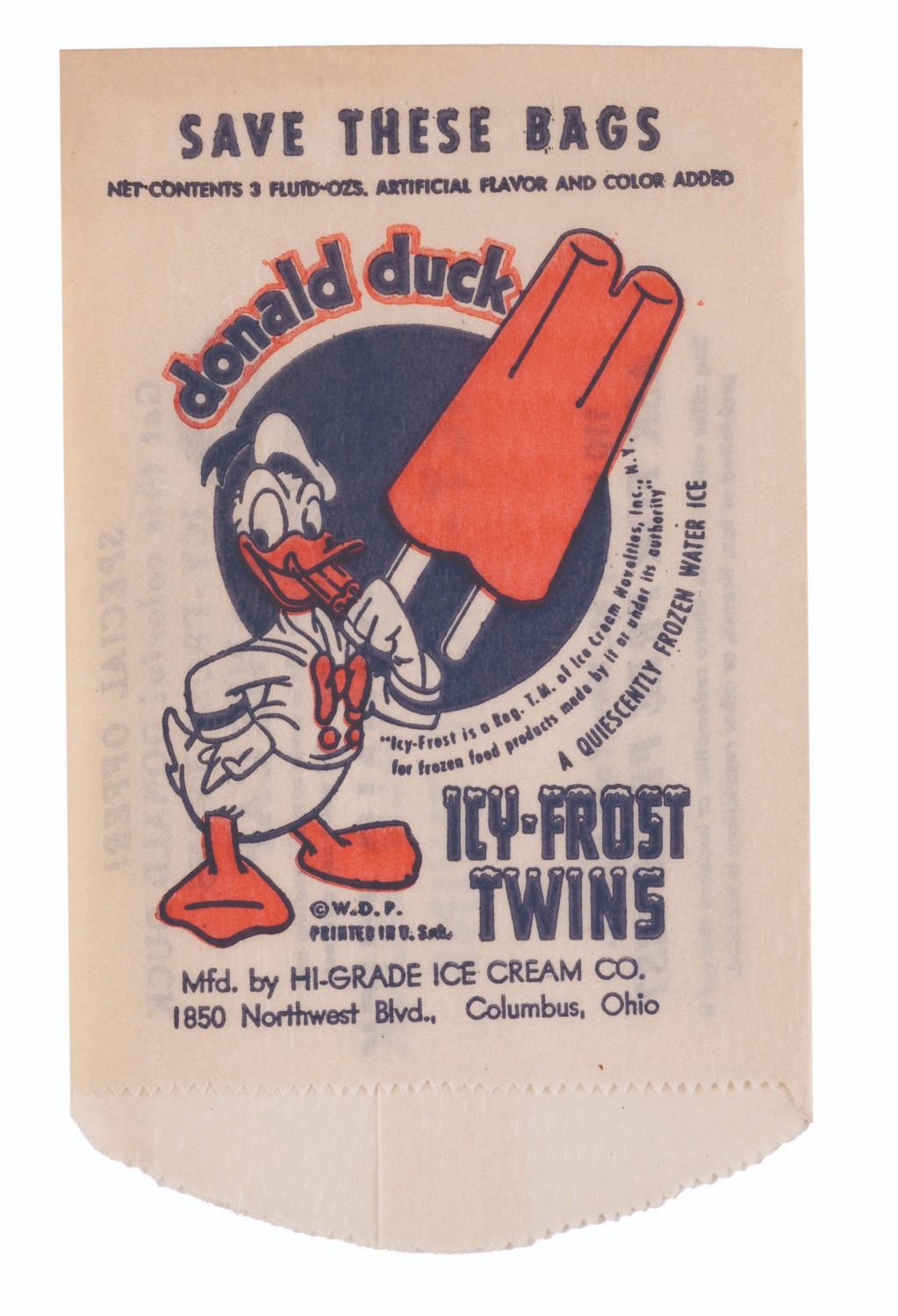(Hi-Grade Ice Cream, 1940s) An unused wrapper for a Donald Duck"Icy-Frost Twins" popsicle. Measuring 3.75" x 6", the bag is in very good condition with light discoloration from age.