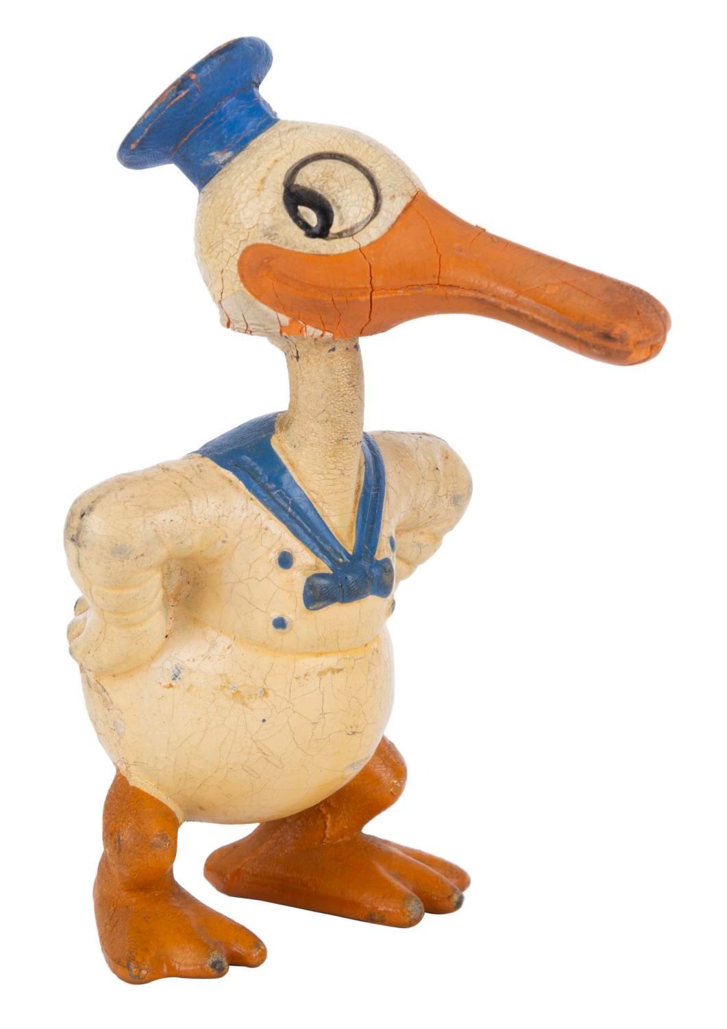 (Seiberling, 1930s) A Donald Duck Latex Figure by Seiberling. The neck is fixed in one position; bonded to the figure from age. Measuring 5” tall, the figurine displays a good condition, with stiffening to material from age, scuffs, crazing, and wear.
