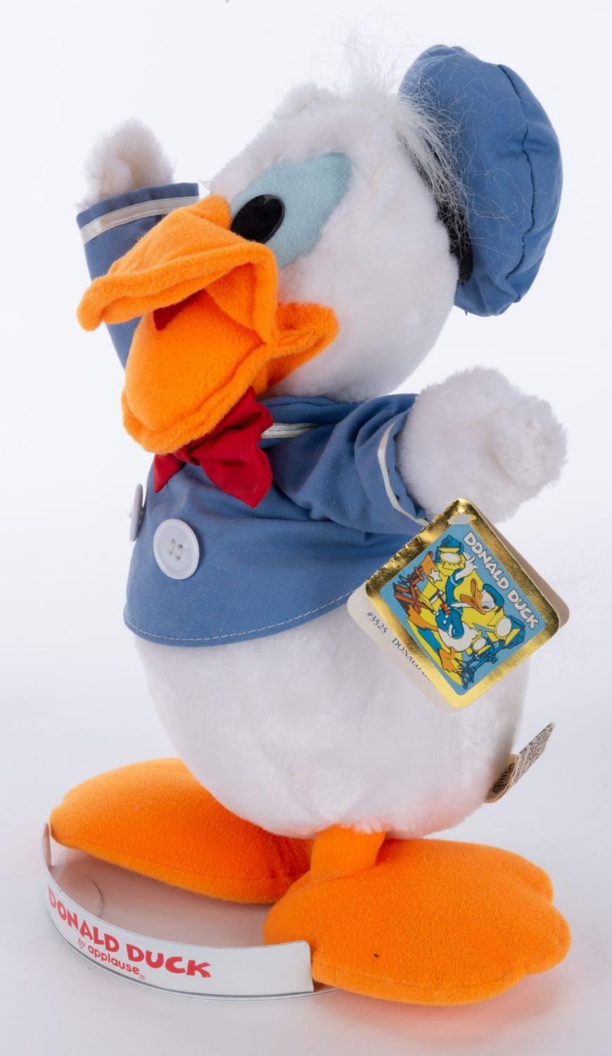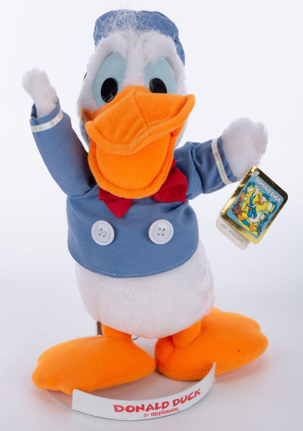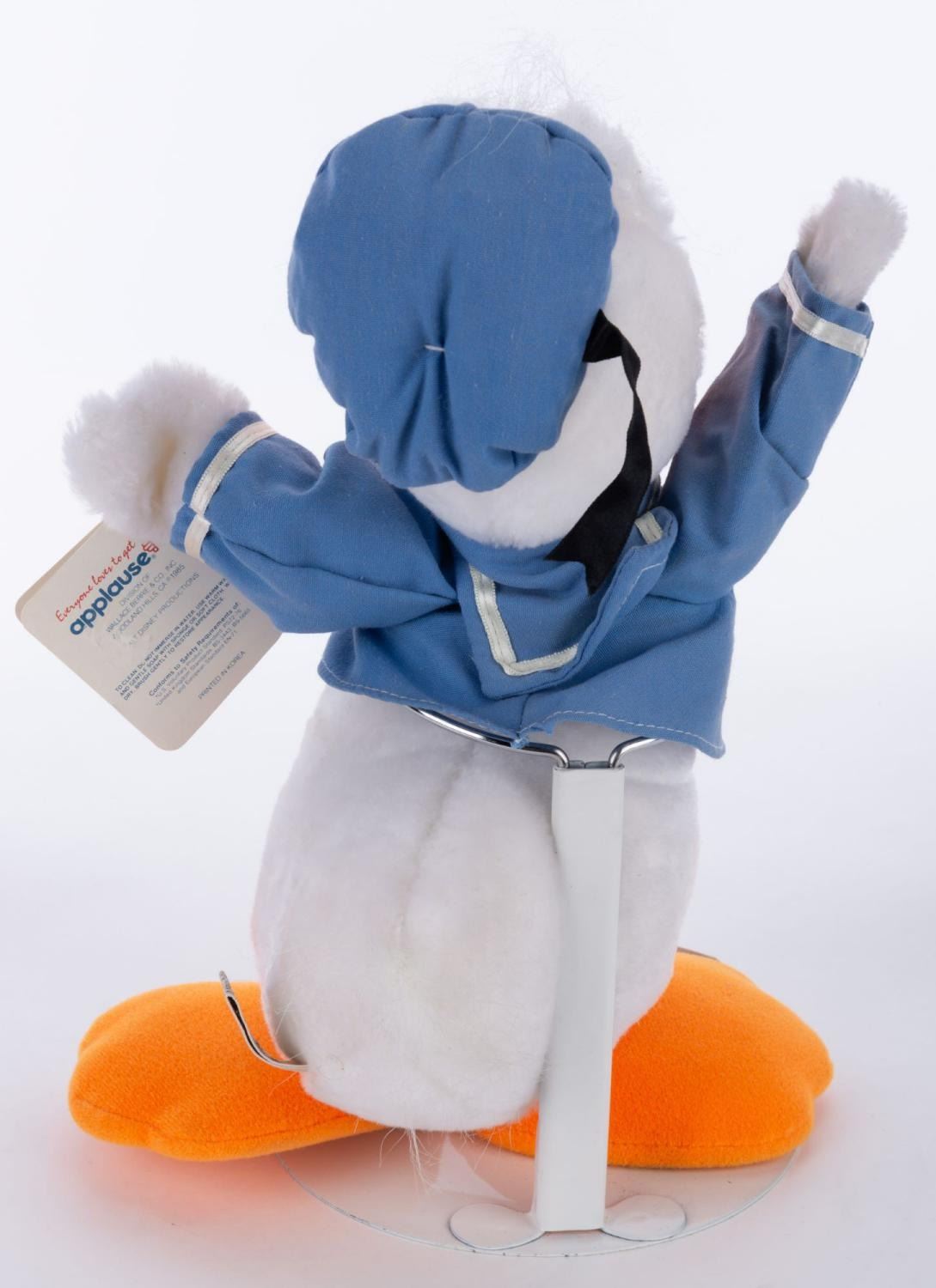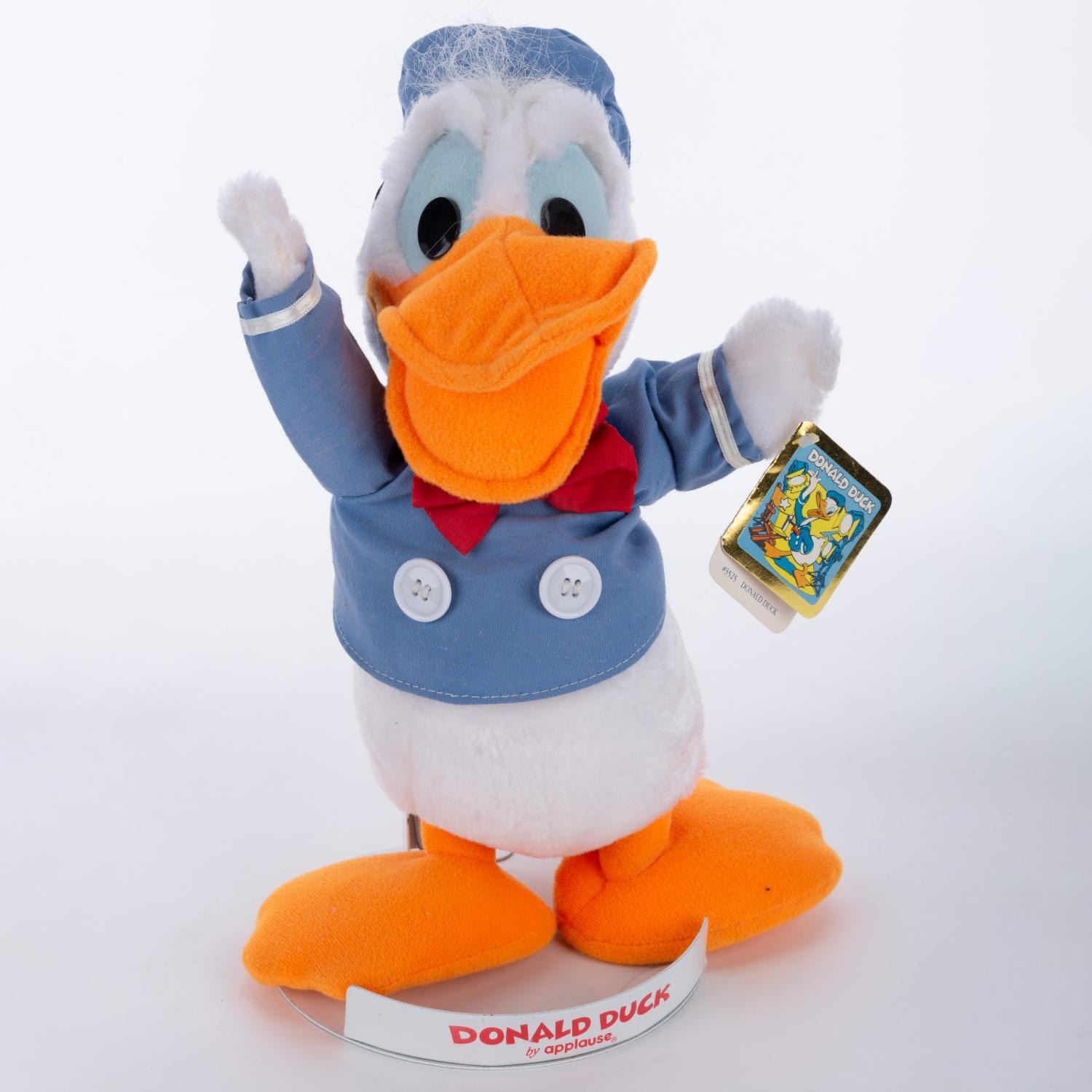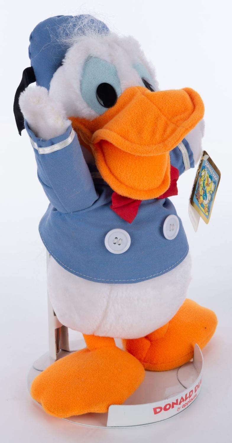 (Applause, 1985) A plush Donald Duck doll with a metal stand. Measuring 12" in length on a 7.5" tall stand, the doll is in very good condition with slight fading from age, and scuffs to the metal stand.
