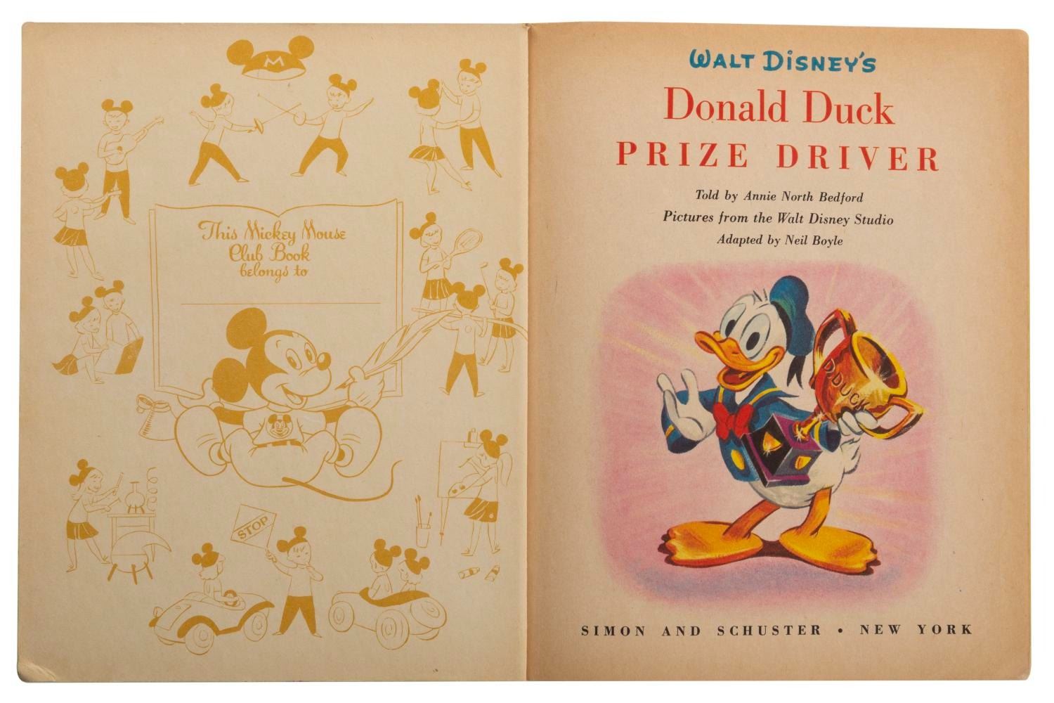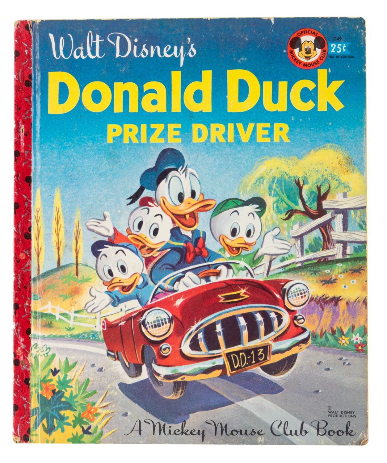(Disney, 1956) A Mickey Mouse Club Donald Duck Prize Driver book. Measuring 6.75" x 8" the book is in good condition with soiling, edge wear, corner bends and scuffing.