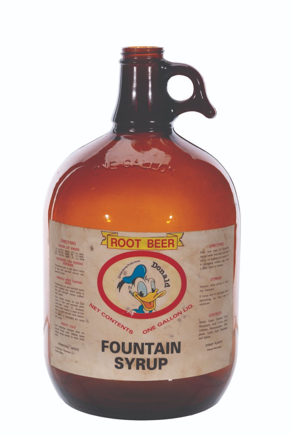 (General Beverages, 1950-60s) An empty one gallon Donald Duck root beer fountain syrup jug. Measuring 6” in diameter and 12” tall, the jug is in good condition with stains, scuffs, discoloration from age, and wear from use.