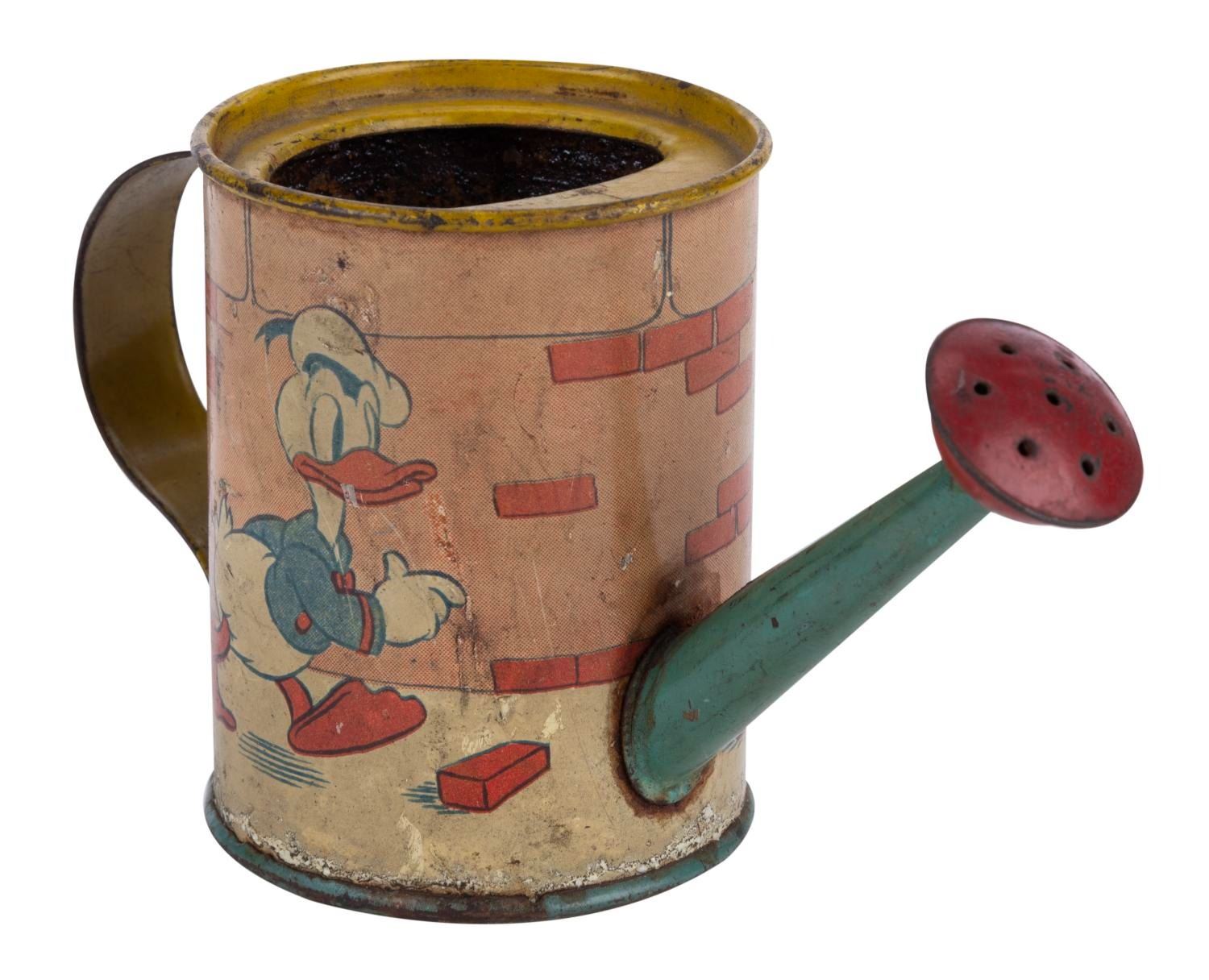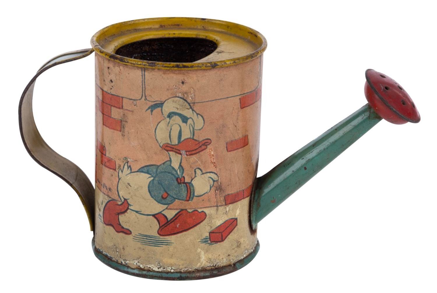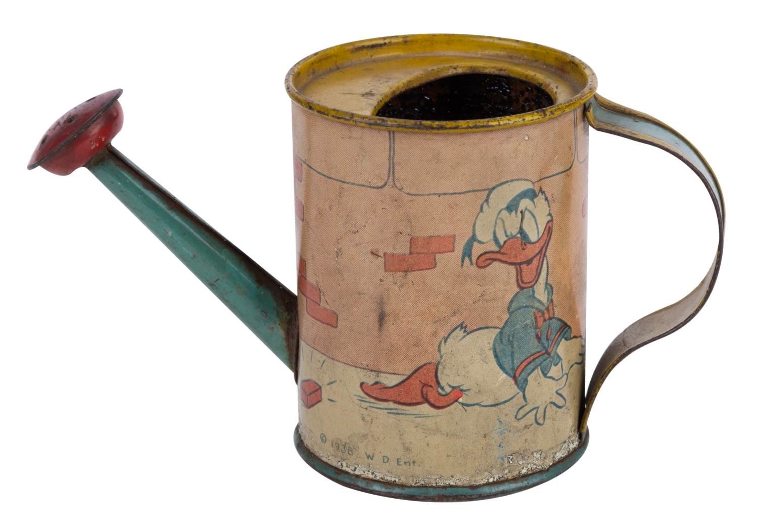 (Ohio Arts, 1930s) A Donald Duck Watering Can by Ohio Arts. Measuring 5.5” in diameter and 3” tall, the miniature tin lithographic toy is in fair condition with dents, oxidation and wear.