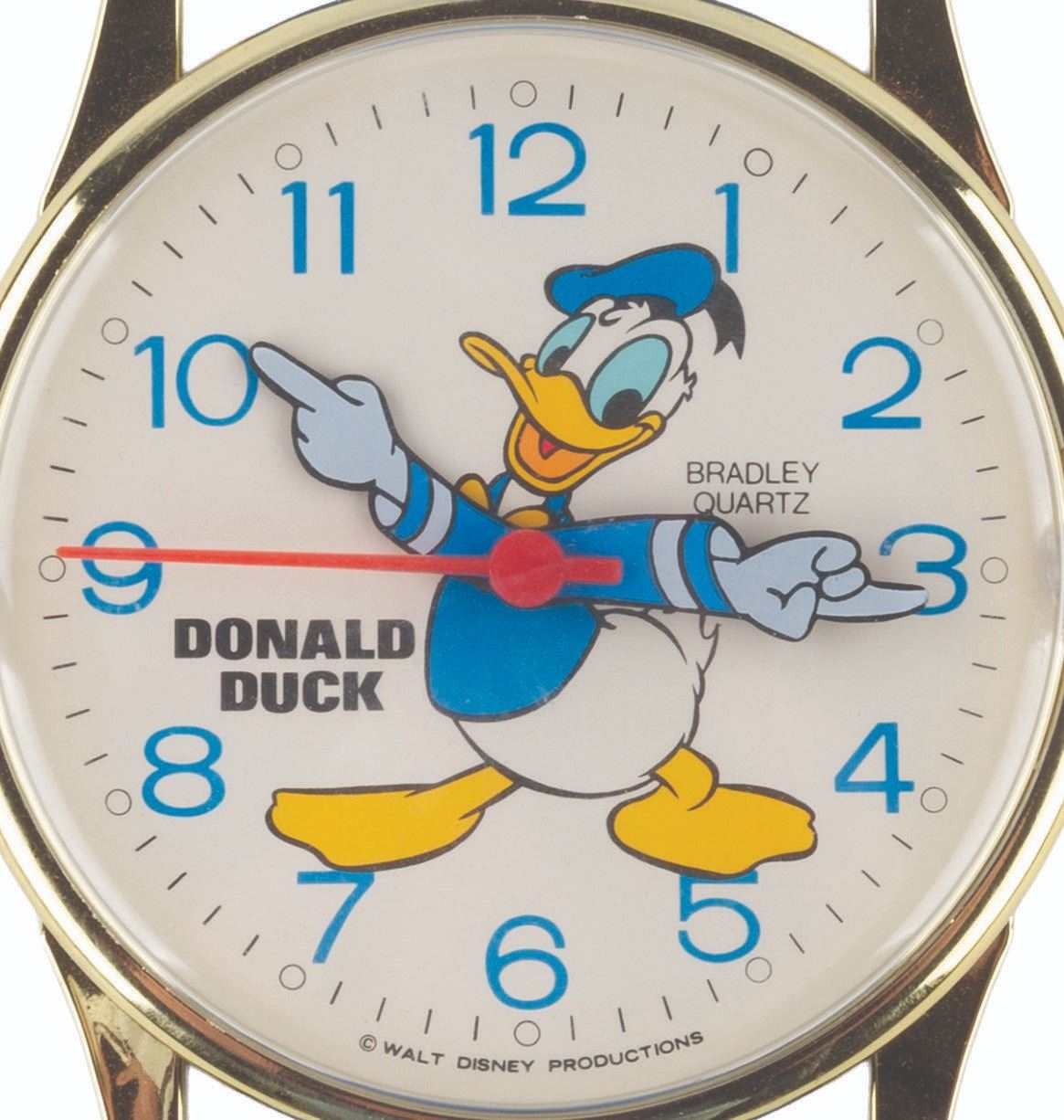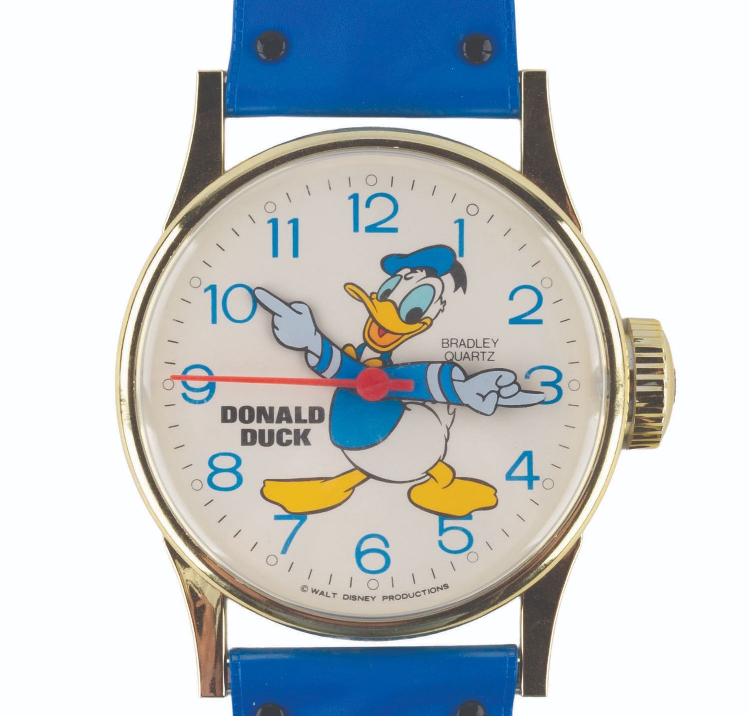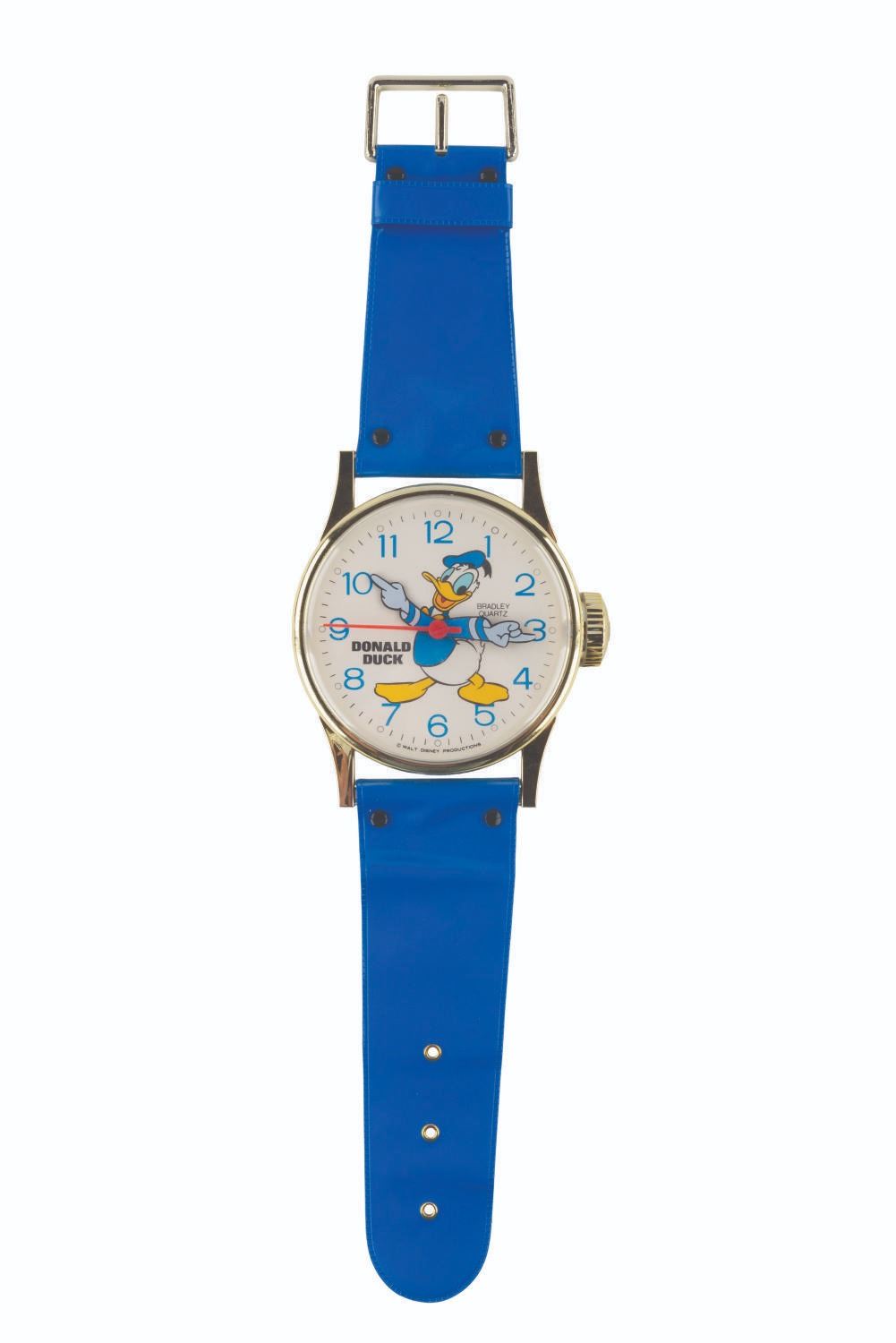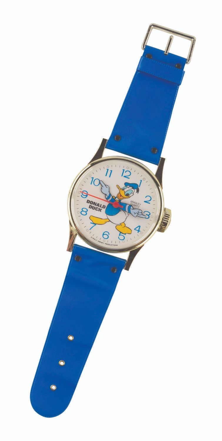 (Bradley, 1990s) A wall clock shaped like an oversized wristwatch featuring Donald Duck. The watch runs on one"AA" battery (not included) and worked when tested. Measuring 6.5" x 1.5" x 26" long, the clock is in very good working condition.