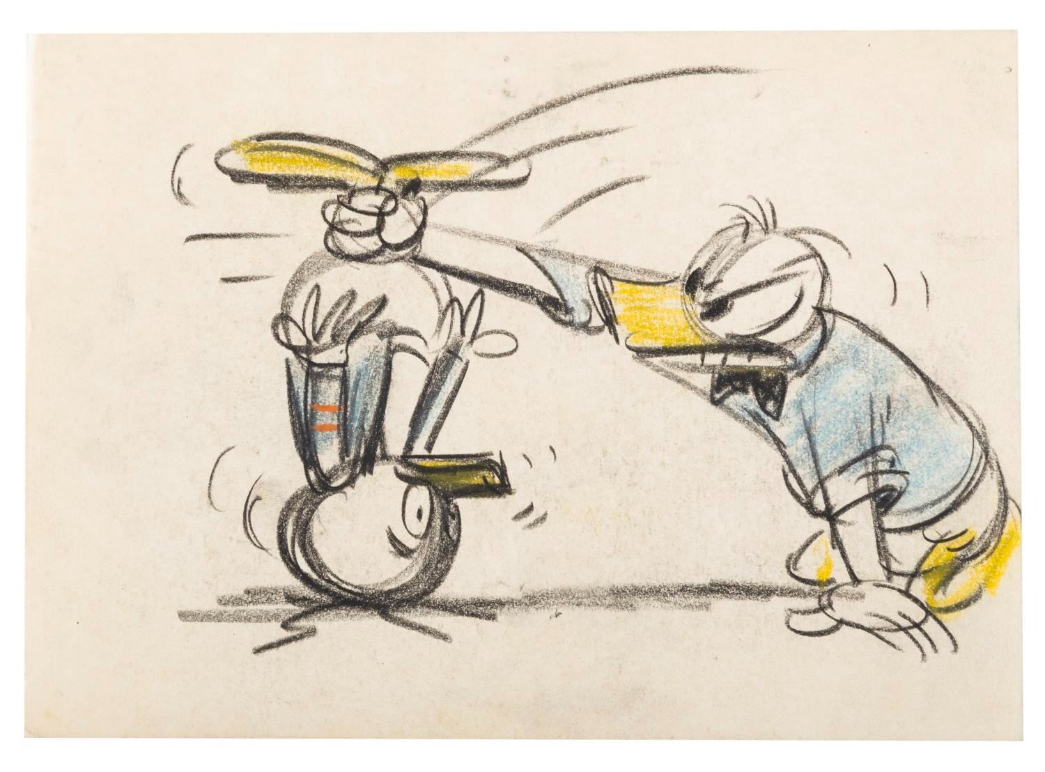 (Disney, 1951) A storyboard panel of Donald Duck and one of his nephews for an unused gag from the short "Lucky Number." Measuring 6" x 8.25", the drawing is accomplished in grease pencils and pastels and is in very good production-used condition.