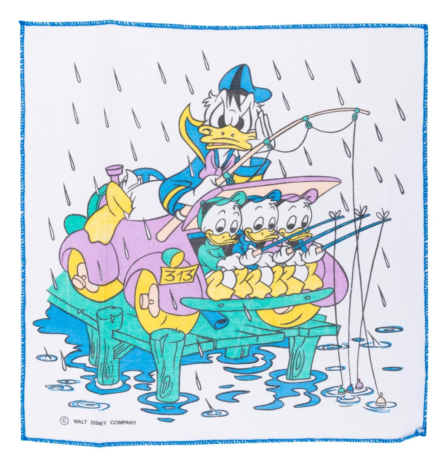 (Disney, 1970s-80s) A handkerchief of Donald Duck, Huey, Dewey, and Louie fishing in the rain. Measuring 10" x 10", the handkerchief is in very good condition with light discoloration from age and wear.