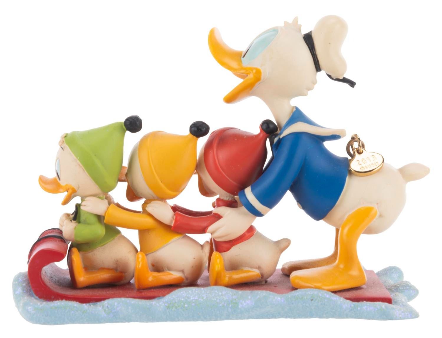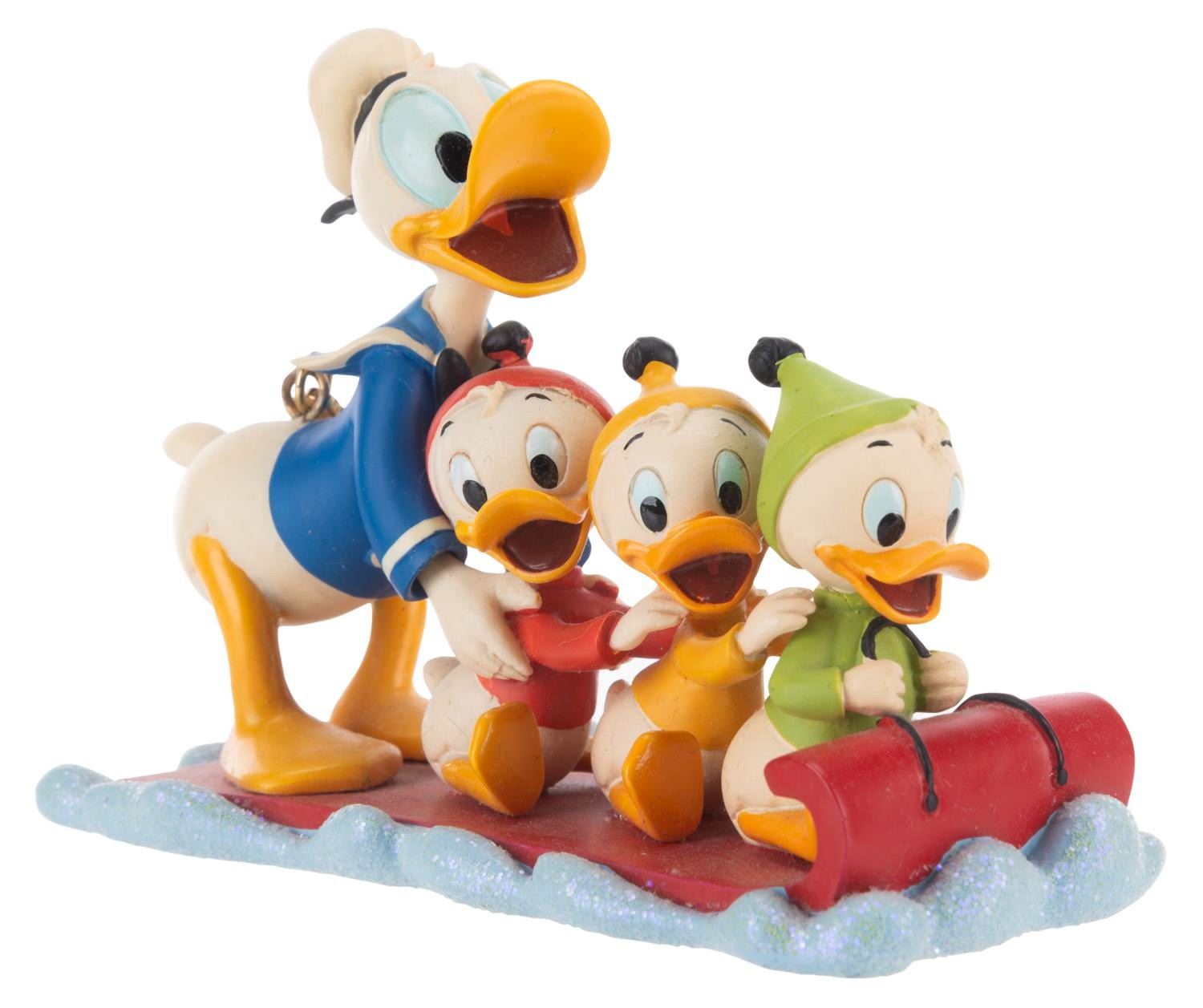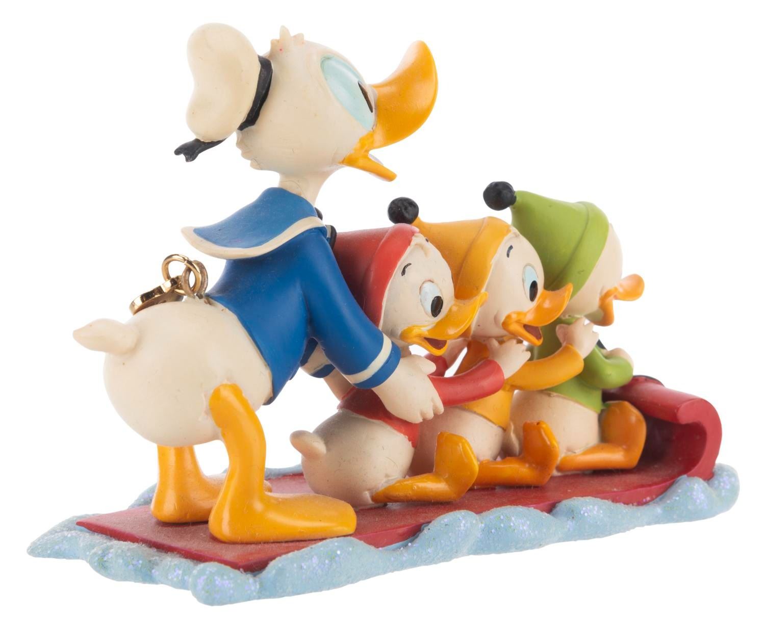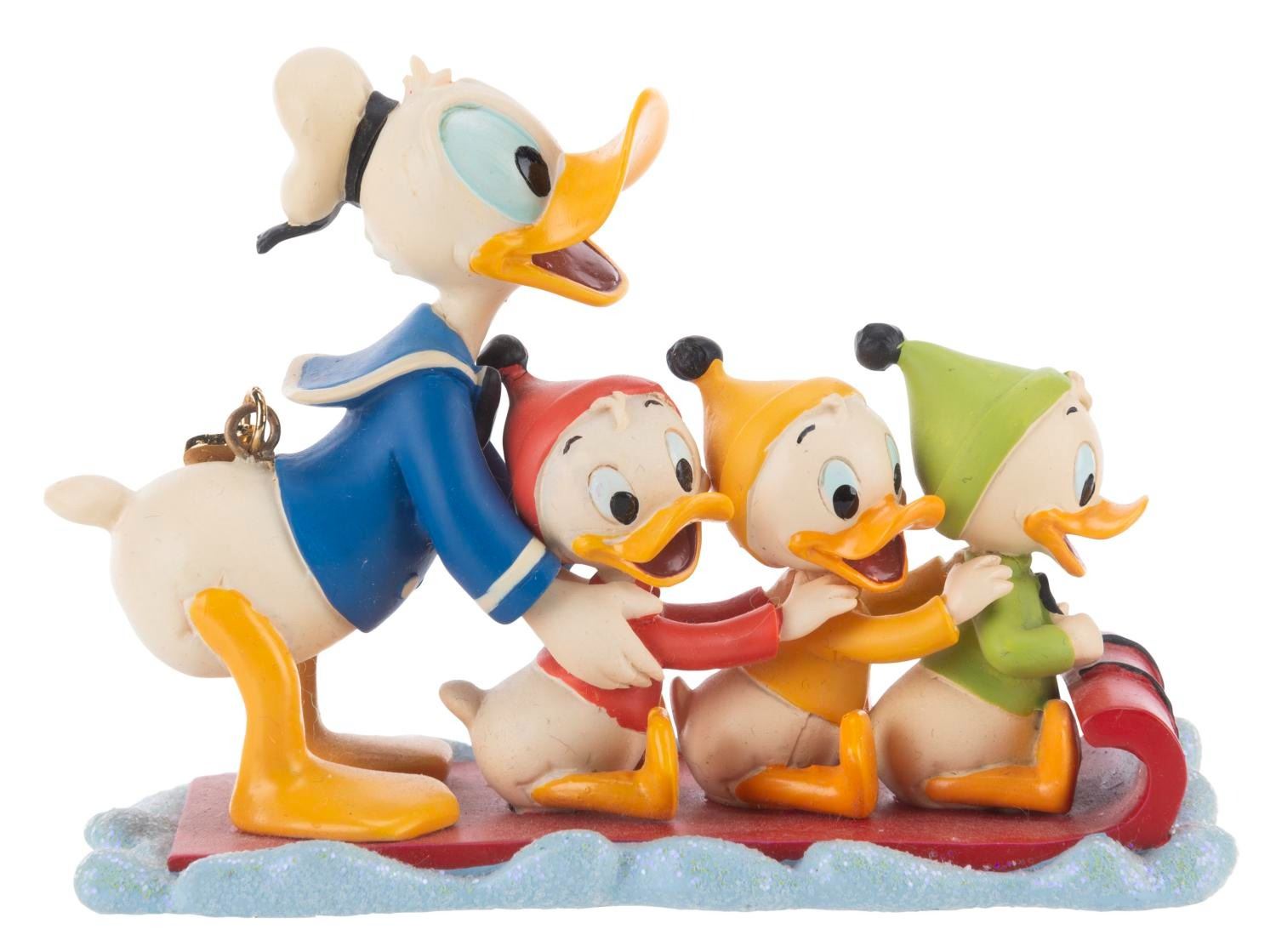 (Disney, 2013) An ornament of Donald Duck with Huey, Dewey, and Louie sledding. Measuring 4.25" x 2" x 3" tall, the resin ornament is in fine condition.